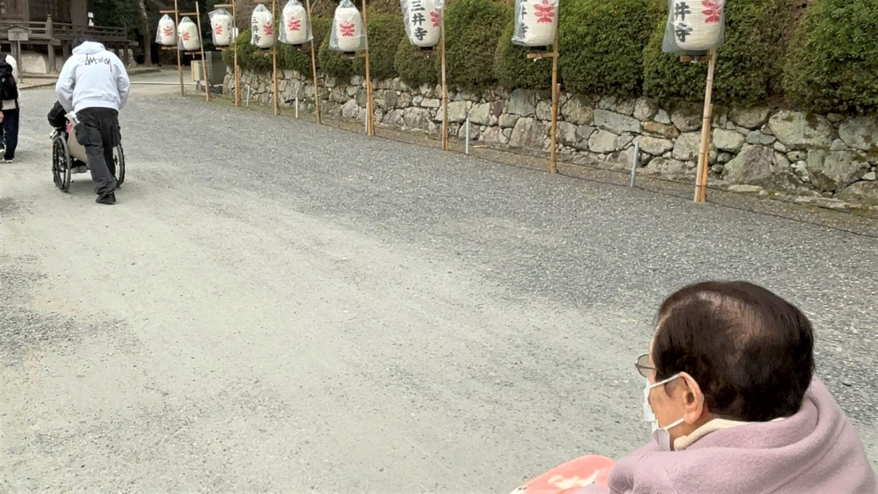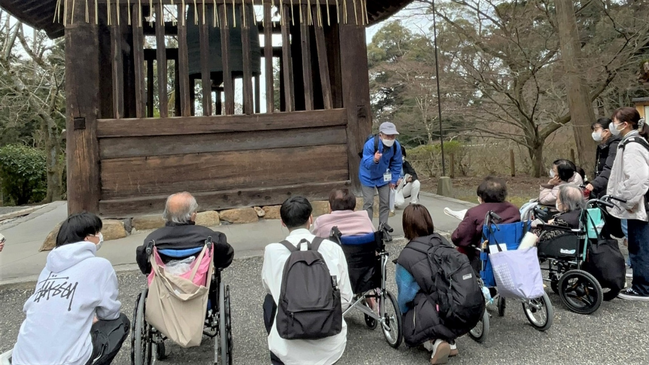 受講生が慣れない車いすを押して砂利の坂道を移動するのはとても大変でしたが、ガイドさんのお話を聞いたり、三井の晩鐘を鳴らしたりして参加者のみなさんは楽しまれているようでした。