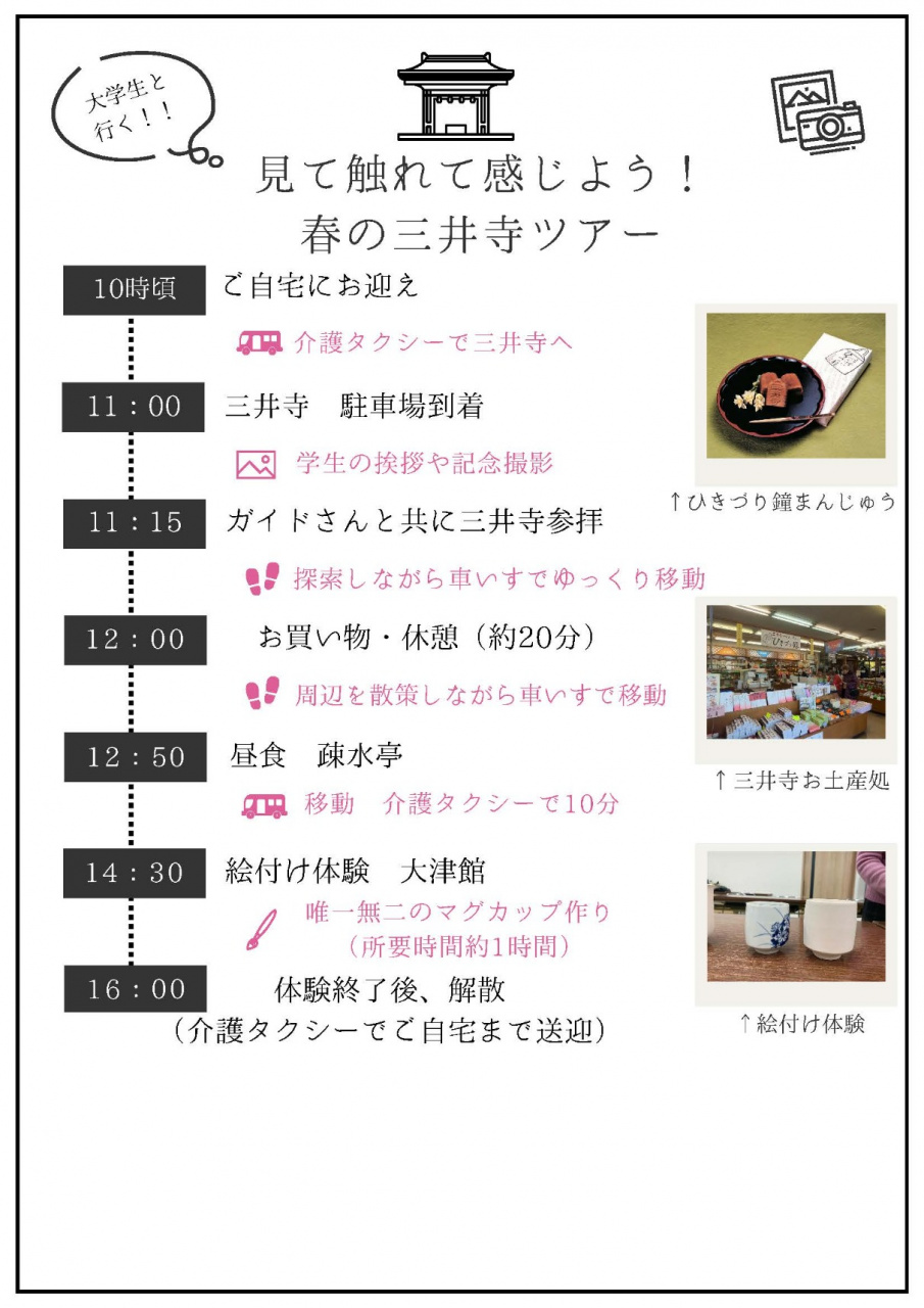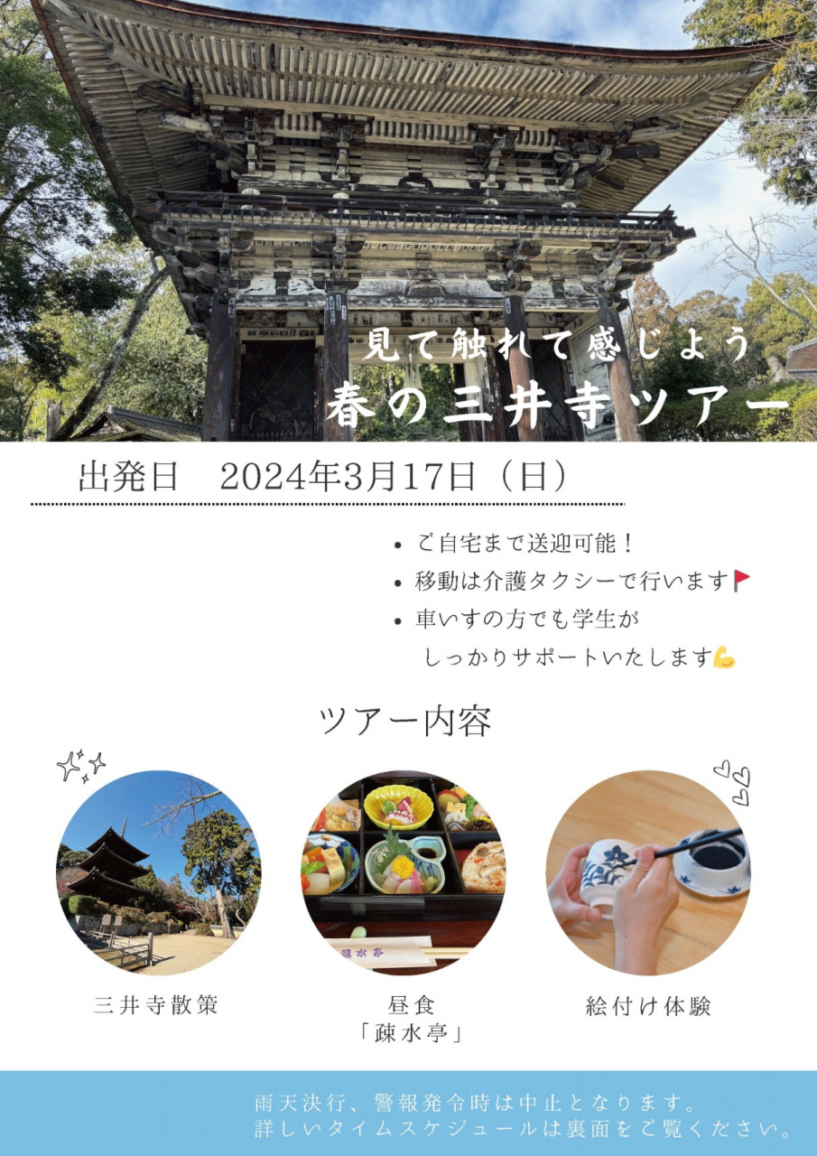 社会学部の『社会共生実習(いくつになっても、出かけられる!~高齢者を元気にする介護ツアー企画~)』(担当教員:現代福祉学科 准教授 髙松智画)では、「見て触れて感じよう 春の三井寺ツアー」を企画し、3/17(日)に実施しました。