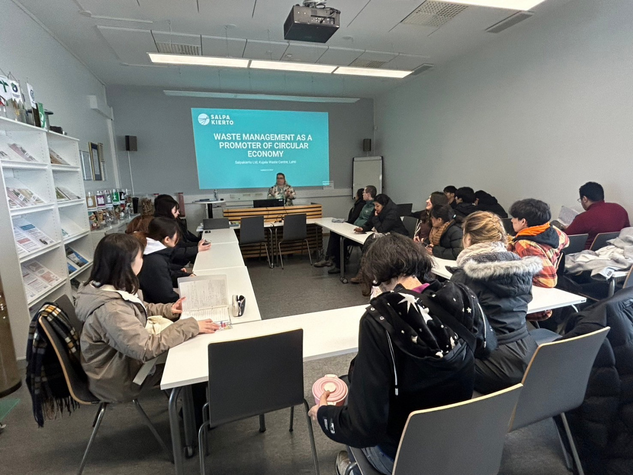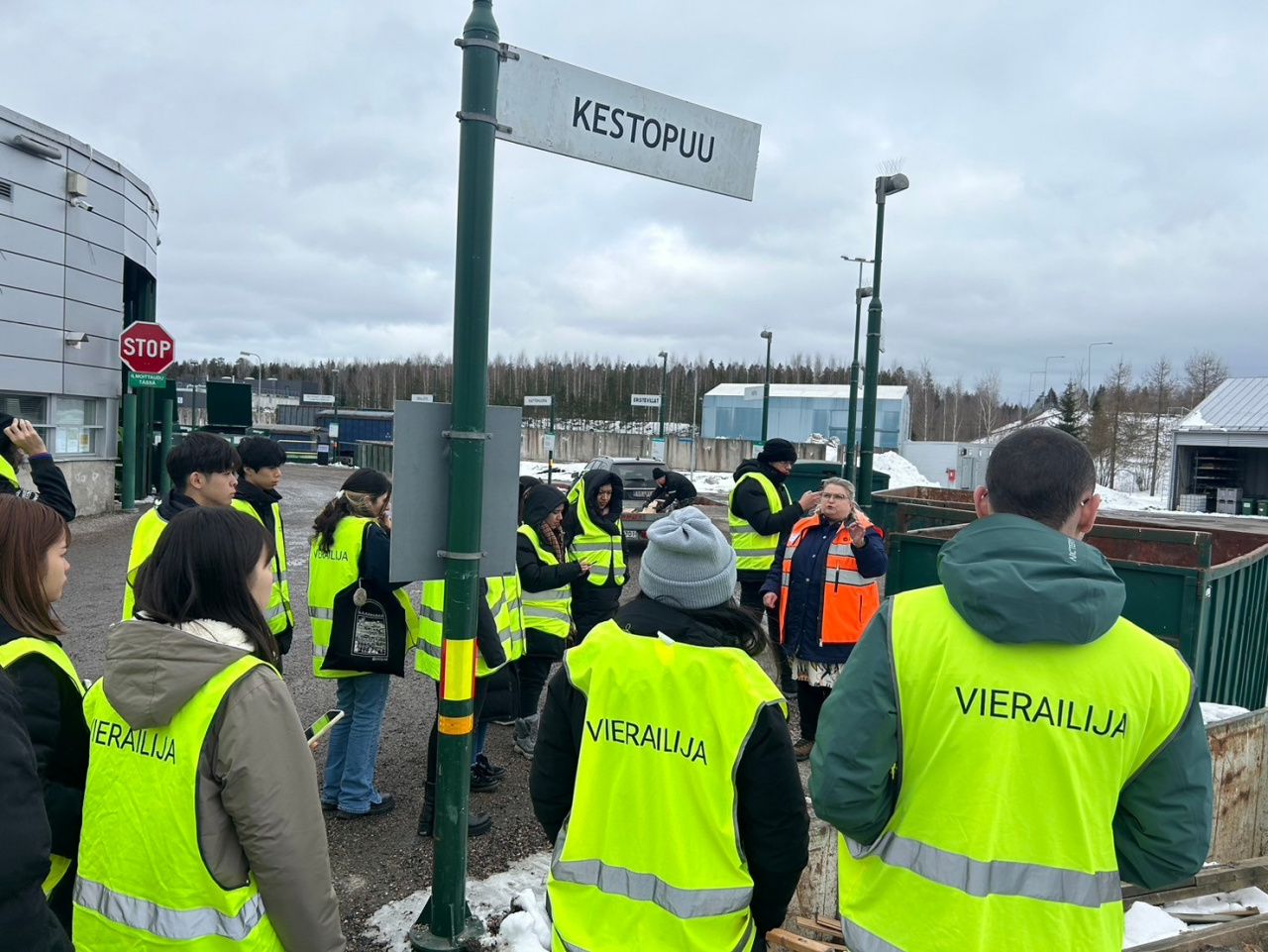 午後からはバスに乗って、「Kujala 廃棄物処理場」と「Lahti Aqua」という地下水の供給・管理などを執り行う施設へ向かいました。廃棄物処理場では運営方法についての説明を受けた後、バスに乗り込み処理場内のツアーとして様々な種類の廃棄物の処理や保管の方法について現場を見ながら説明を受けました。次の地下水の管理にまつわる企業では、企業概要の説明動画とともに解説を受けました。