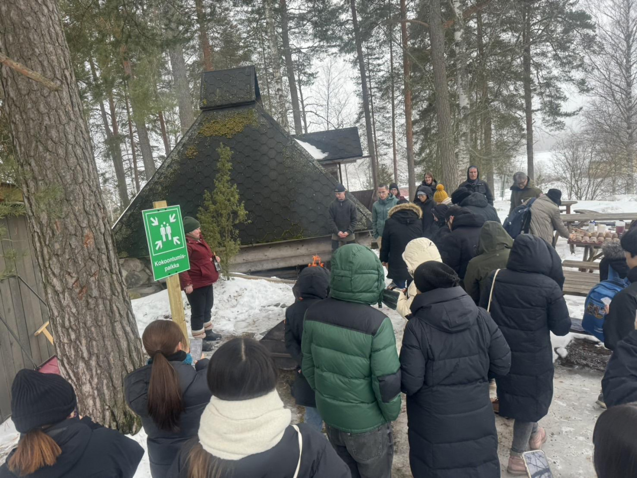 15:00頃には、ネイチャー・ガイド研修所を訪れました。焚き火でつくるという、昔ながらの方法で入れたコーヒーと共に、炙ったマシュマロやシナモンロールをいただきました。その後、バスから降りて凍った湖の上でLABの学生と雪合戦をして遊んだり、写真を撮ったりと普段できないような体験をしました。その後、カリサルミ橋が見える湖の上で橋を背景に記念撮影を行いました。