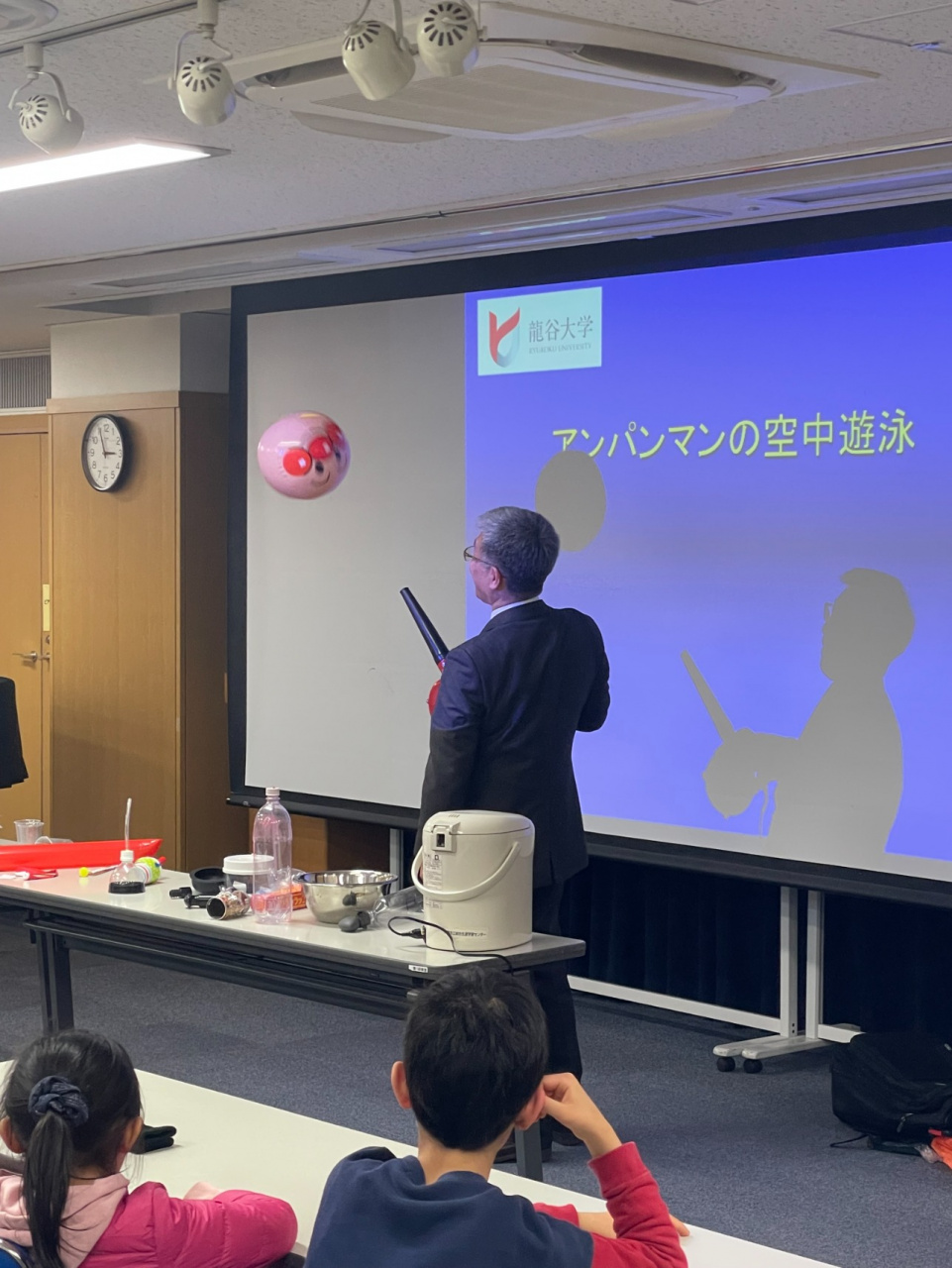 その後,水を入れたコップにふたをしてひっくり返しても水がこぼれないことやアンパンマンのビーチボールが回転しながら斜めになっても落ちないことなどを演示実験で見せながら,野球の変化球やマジックのように見えることも科学の裏付けがあることを子ども達にも分かりやすく説明.