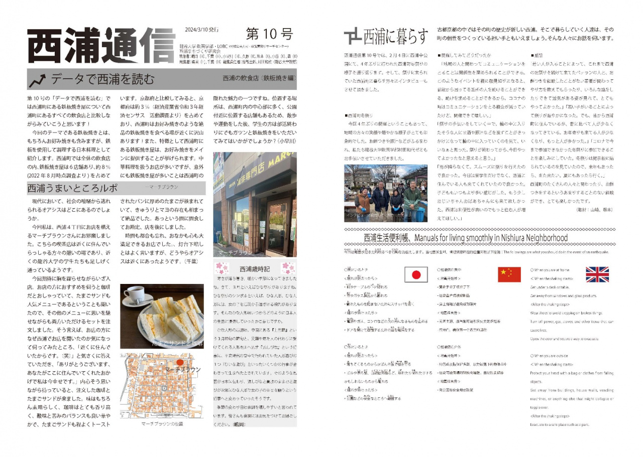 2024.03.29 服部ゼミ&村田(和)ゼミが「西浦通信第10号」を発行【政策学部】 #教育 服部圭郎ゼミと村田和代ゼミとで制作している大学の地元である西浦のニュースを届ける「西浦通信」 第10号が発行されました! ●こちらからご覧ください。