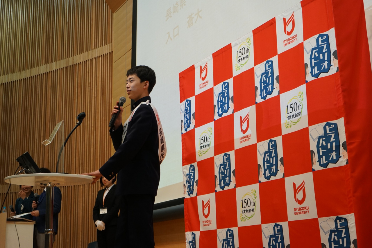 当日は、全国から地方大会等を勝ち抜いた46名の中学生バトラーが参加。一次ラウンド、準決勝を戦い、6名が決勝に進出され、結果、関西創価中学の中村修都さんが「脳の外で考える」を紹介し優勝されました。