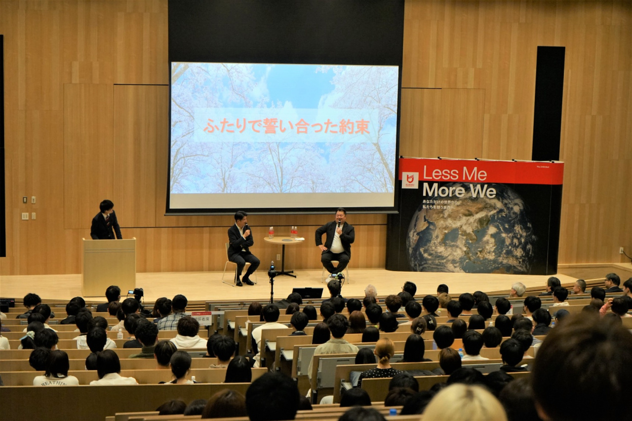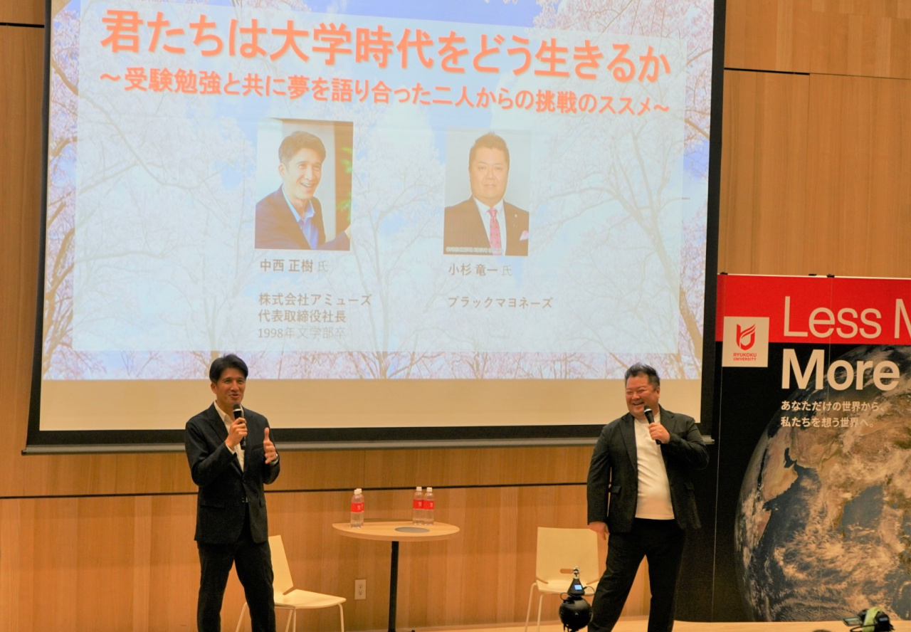株式会社アミューズ代表取締役社長 中西正樹氏(1998年文学部卒)と30年来の親友であるブラックマヨネーズ 小杉竜一氏にご登壇いただき、予備校時代の思い出や苦悩と約束、大学時代・青春時代の多くの人との出会い、社会人になってからの夢の再会などについてお話しいただきました。