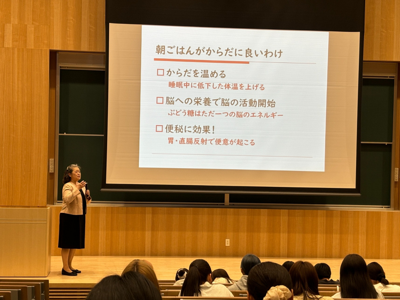 羽溪了教授からは趣旨と目的の説明があり、私たちがいのちをいただいて生かされていることに改めて気付かされました。「健康と食事について」では、野口聡子教授からいのち(身体と心)を健やかに保つ食事の大切さ、特に朝ごはん、規則正しい排泄の重要性についてお話を聞きました。また京都の食文化の特徴のひとつである「京の仕出し文化」を体験的に学ぶために、献立の解説を聞いたうえで、仕出し弁当(三友居製)を仲間と一緒にいただきました。