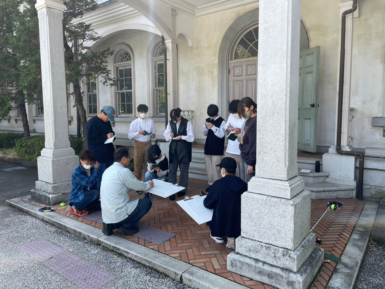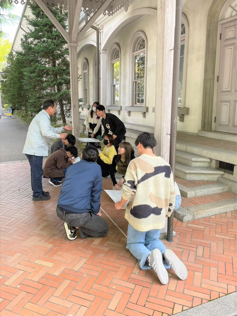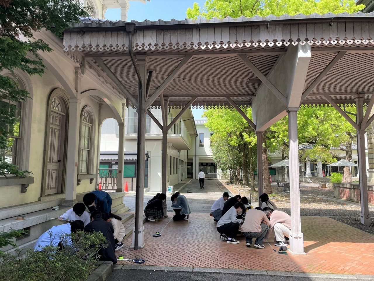まず、遺構実測図の意義やその作成方法について講義を受けたあと、受講生は各班に分かれ、大宮学舎本館の周囲で実測実習を行いました。
