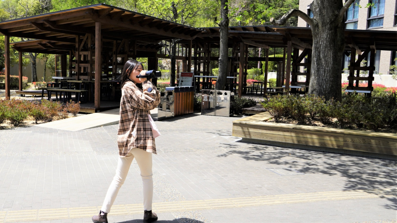 その後、グループに分かれハンディビデオカメラを持ち、校内で校舎やウッドデッキ、キッチンカーなどを被写体にし角度や距離を考えながら工夫して思い思いの動画を撮影しました。