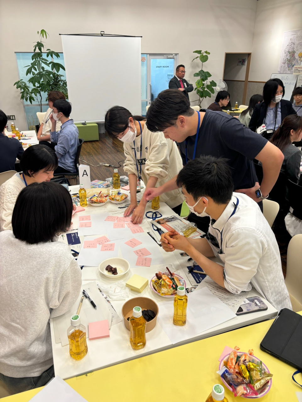後半は4つのグループに分かれて、日常の困りごとの解決策を話し合うことで参加者の交流を図りました。電車移動時の隙間時間を有効活用できるよう、車内に交流ラウンジを設けることや、スーパーの商品の値段を比較できるようなアプリ開発といった案が発表されました。
