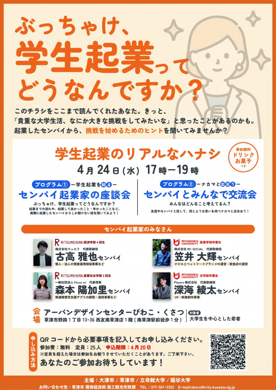 草津市、大津市、立命館大学、龍谷大学の4者共催で、若者の創業機運を高めることを目的としたイベントを開催。立命館大学、龍谷大学の学生をはじめ、1年生から4年生までの学生約20人が参加し(内、龍谷大学生8人)、先輩の助言に耳を傾けました。