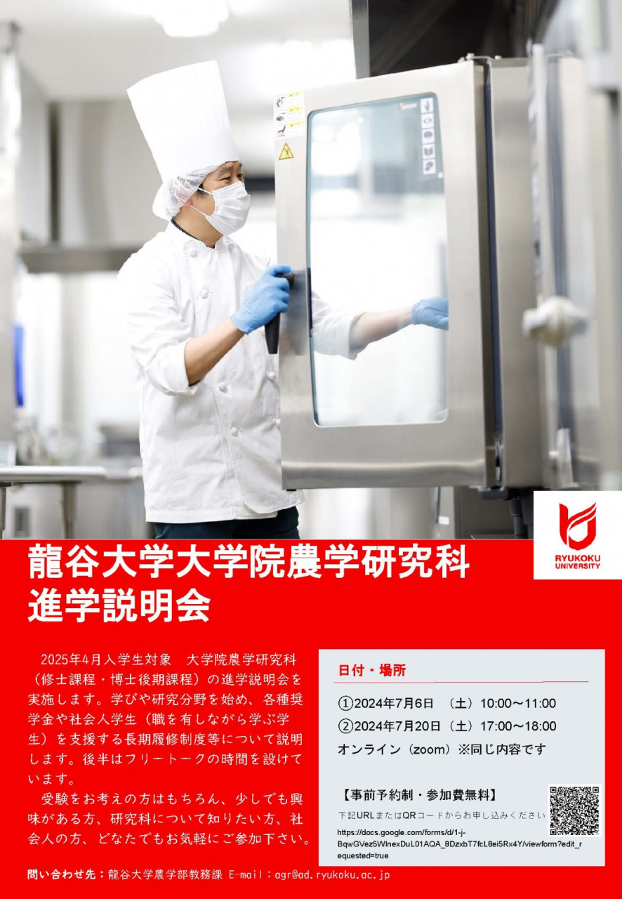 農学研究科では、大学院進学説明会(2025年4月入学)をオンラインで実施します。学内外問わず、また、社会人の方(職を有しながらの通学をお考えの方)等、どなたでもご参加いただけます【事前予約制・参加費無料】。