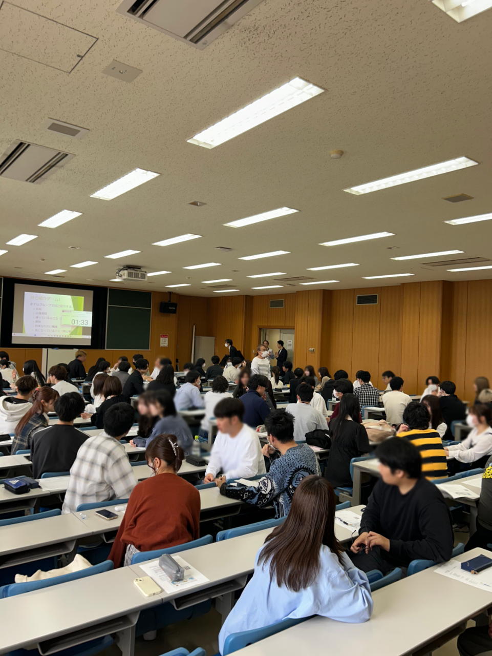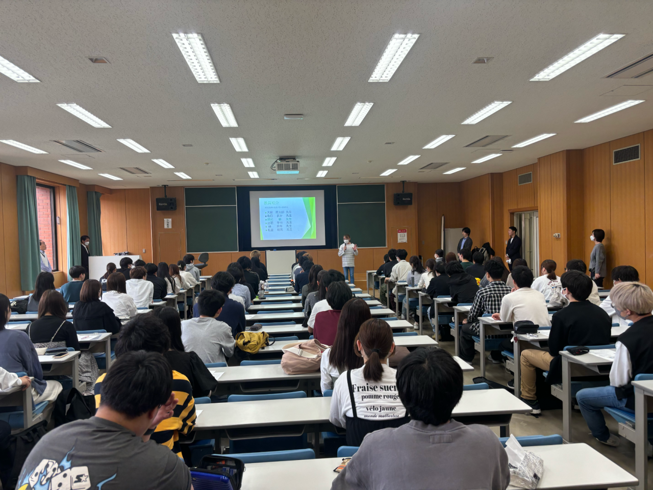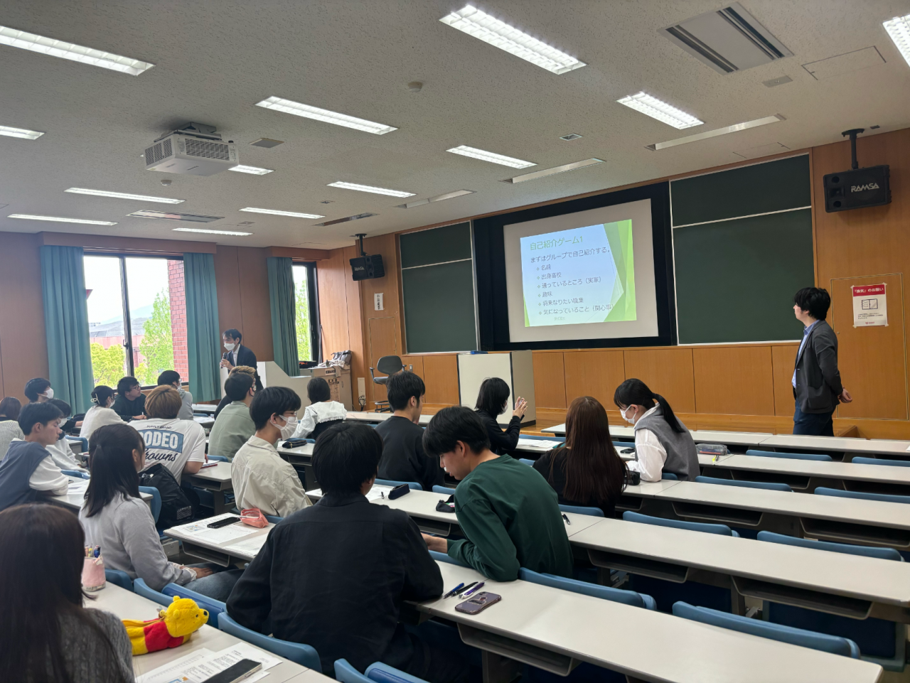 哲学科教育学専攻では、4月26日(金)に新入生歓迎会を実施しました。日頃は、3クラスに分かれて別々の教室で授業を受けているのですが、この日は、約70人の学生が同じ教室に集いました。