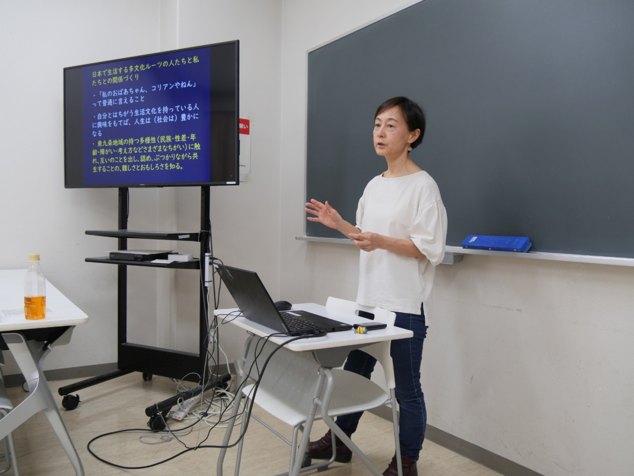 多文化共生をめざし東九条で支援を行うNPO法人東九条まちづくりサポートセンターの村木美都子事務局長を講師に迎え、「国際福祉実習」の事前学習としての特別講義を実施しました。