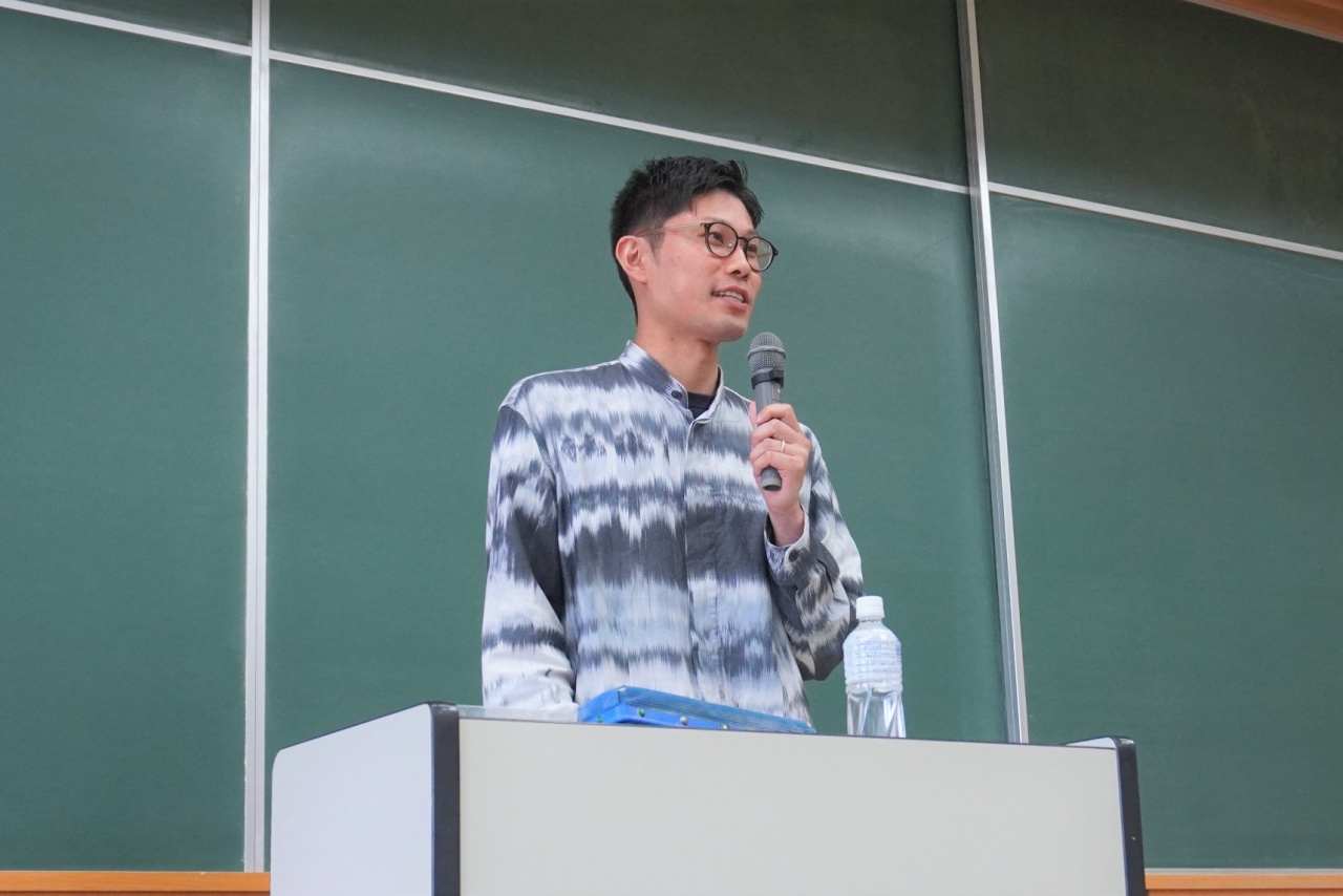 龍谷大学法学部は5月20日、京都とアフリカ・トーゴの伝統産業をつなぐ事業を展開する中須俊治さんを招いて講演会を開きました。内田孝・非常勤講師が担当する3、4回生対象の専門科目「マスコミ論Ⅰ」の一環で、授業で中須さんの起業に至るまでの歩み、事業の実際と昨年夏のアフリカでの交通事故などを紹介しており、受講生約90人が事前に質問を提出したうえで参加しました。