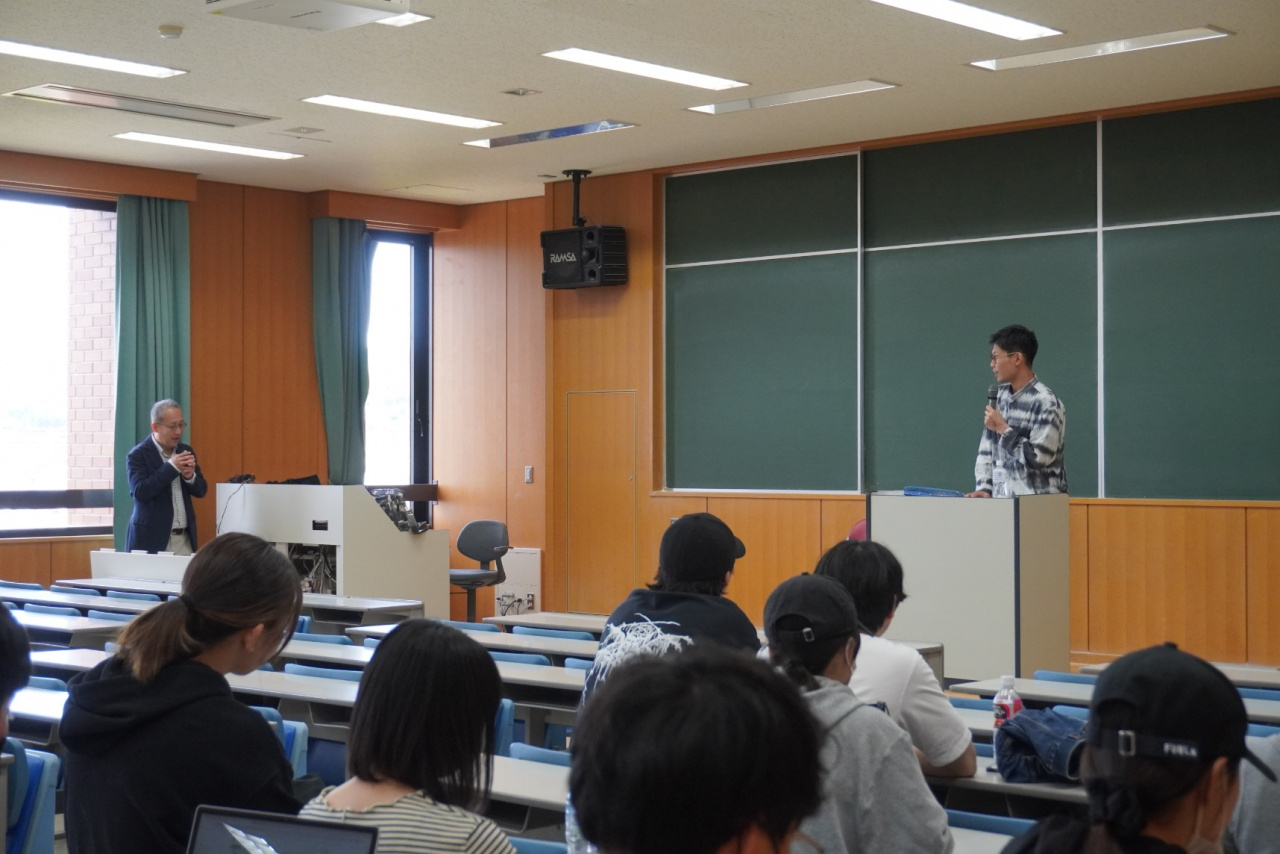 深刻になりそうな交通事故なども含め、波乱万丈の生き方を笑顔で語る中須さんの話に、受講生たちはみな引き込まれて聞き入っていました。質疑では、卒業後の生き方や就活をクリアする方法を尋ねる質問が続きました。これに対し、中須さんからは具体的に社会人とのコミュニケーションの取り方、深め方の解説がありました。就活については、「大学時代にやってきたこと=過去と、卒業後に就職先でやりたいこと=未来がつながるように構成し、自信をもって相手に伝えられれば大丈夫」と助言しました。また、「海外に行って、流行のファッションを知りたい」との相談には「円安で海外に行く人の少ない今こそ、海外を体験する意味がある」との持論を示し、それぞれが自らの知恵を絞って夢を実現するよう励ましました。終了後にも質問に訪れる受講生もおり、よい刺激になったと感じられる授業でした。