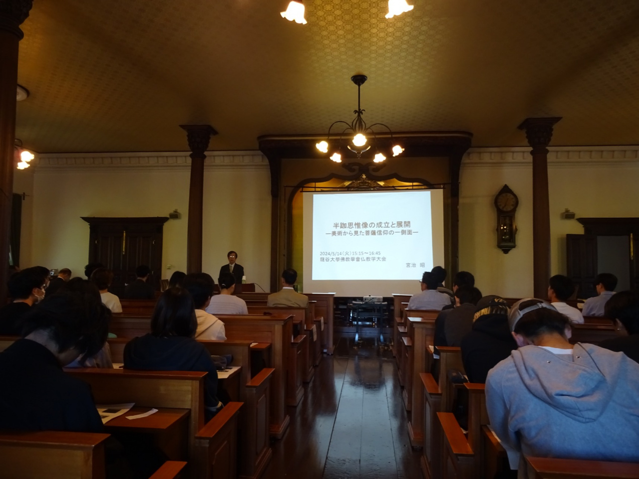 ご講題は「半跏思惟像の成立と展開-美術から見た菩薩信仰の一側面-」で、ガンダーラにおいて太子時代の釈尊の姿として現れた半跏思惟像が、観音や弥勒といった悟りを目指し、人々を救う菩薩の姿として、中国や韓国、そして日本で受容され、時代・地域によって様々に展開していく様を、多くの美術作品を提示されながら、お話をしていただきました。仏教学科の学生を中心に150名を超える方々にご参加いただき、とても充実した大会になりました。