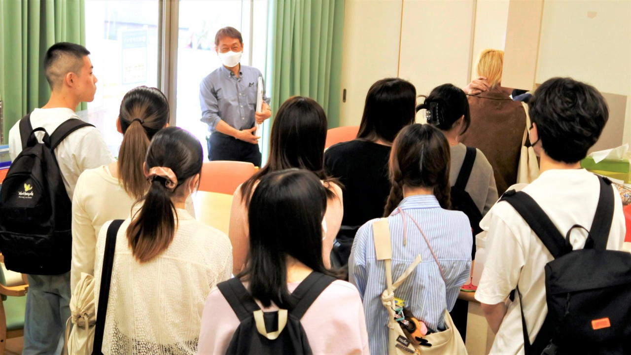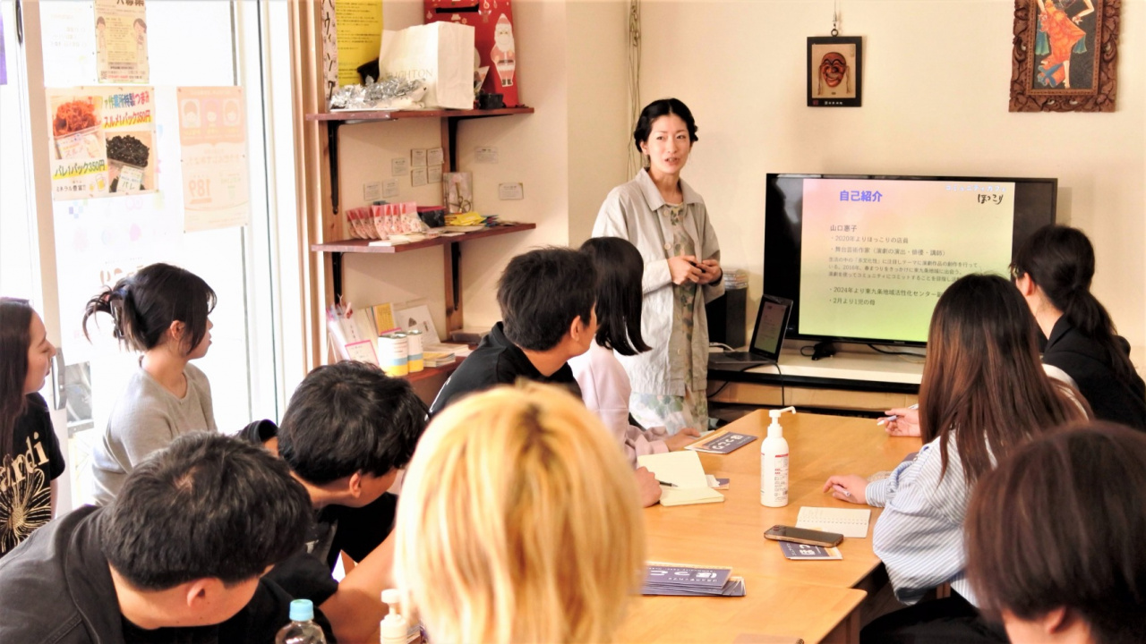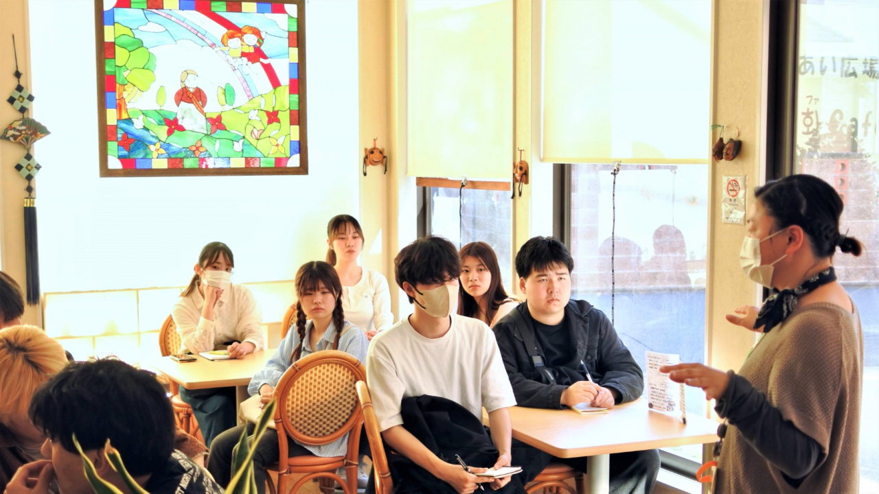 「コミュニティカフェほっこり」では、運営しているNPO法人東九条地域活性化センターの山口恵子さんと小林栄一さん、木之本マリルさんからオリエンテーションを受けました。山口さんからは「地域が変化していく際に、東九条の歴史を消し去ることがないようにしなければならない。私たちは東九条の歴史を継承しながら、小さな生活応援の実践を積み重ねています」と活動の根っこにある思いが示されました。小林さんからは「いま代替わりを進めており、若い人の感覚を求めています。若者のアイデアを聴かせて欲しい」との期待が寄せられました。