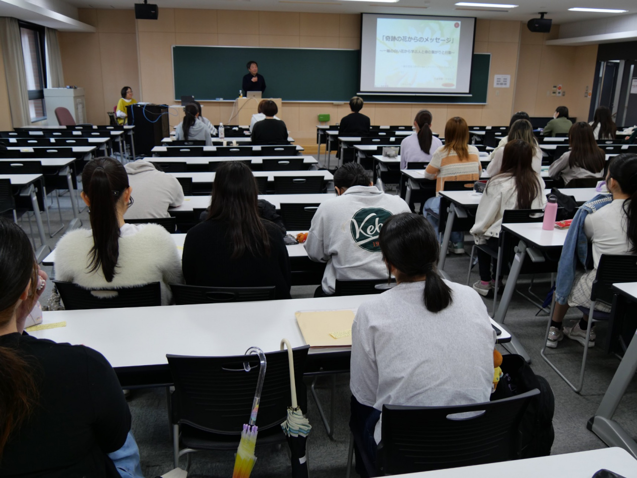 キャンパス内で育てているフランス菊が満開の中、アイリンブループロジェクトリーダーの管原淳一さんにお越しいただき、副リーダーの佐藤美香さんにはオンラインで参加していただき、特別講義を実施しました。