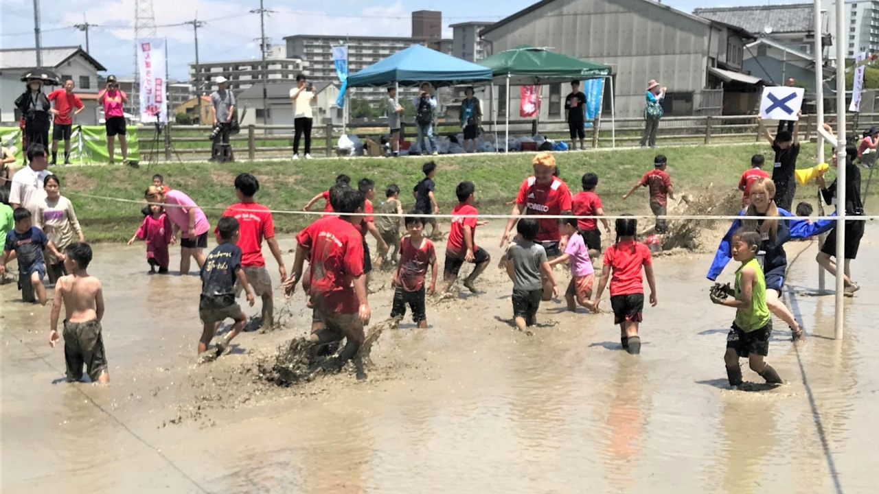 「田んぼラグビー」は、水を張った田んぼで1チーム4人程度で行うラグビーです。激しい身体接触がなく、老若男女問わず誰でも泥だらけになって楽しめるスポーツです。今年で第5回目となる向島田んぼラグビーは、ラグビーを通じた人のつながりを築き、地域活性化、農業や食への理解を促す地域の一大イベントとなっています。