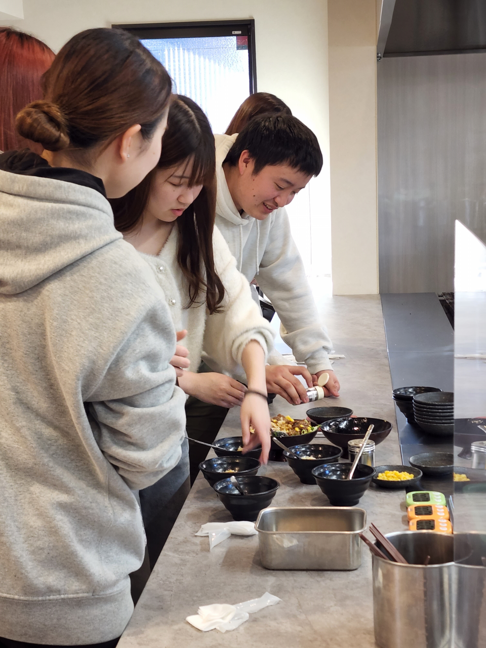 今回は1年生(当時)のゼミ生16名が2チームに分かれ、2023年9月から約9か月かけて商品の構想、試作やレシピの作成、販売ターゲットやキャッチコピーを考案しました。その成果として、株式会社やる気大島社長ほか社員の皆さんの前で新商品のプレゼンテーションを実施し、今般、「ガツンとバターコーンのカルビ丼」の発売が決定しました。
