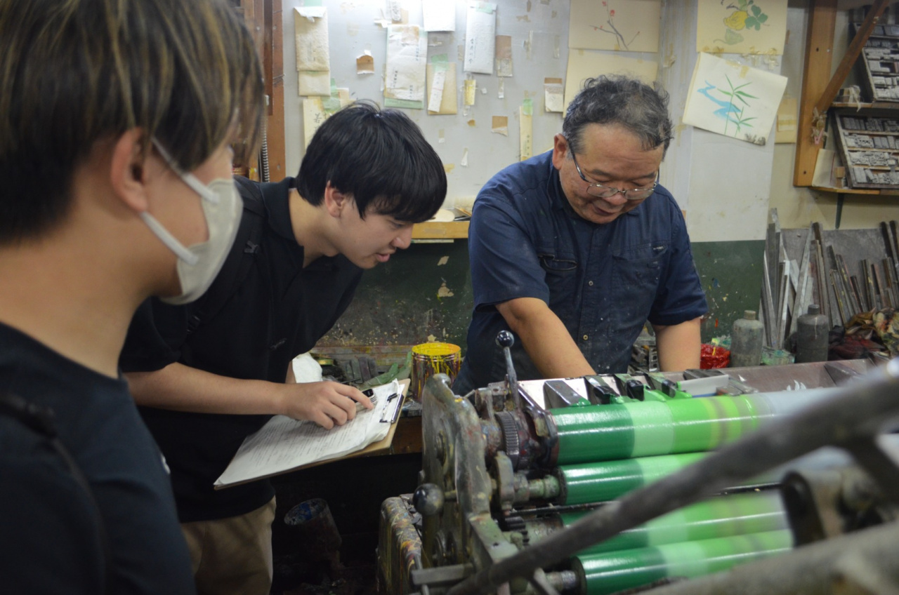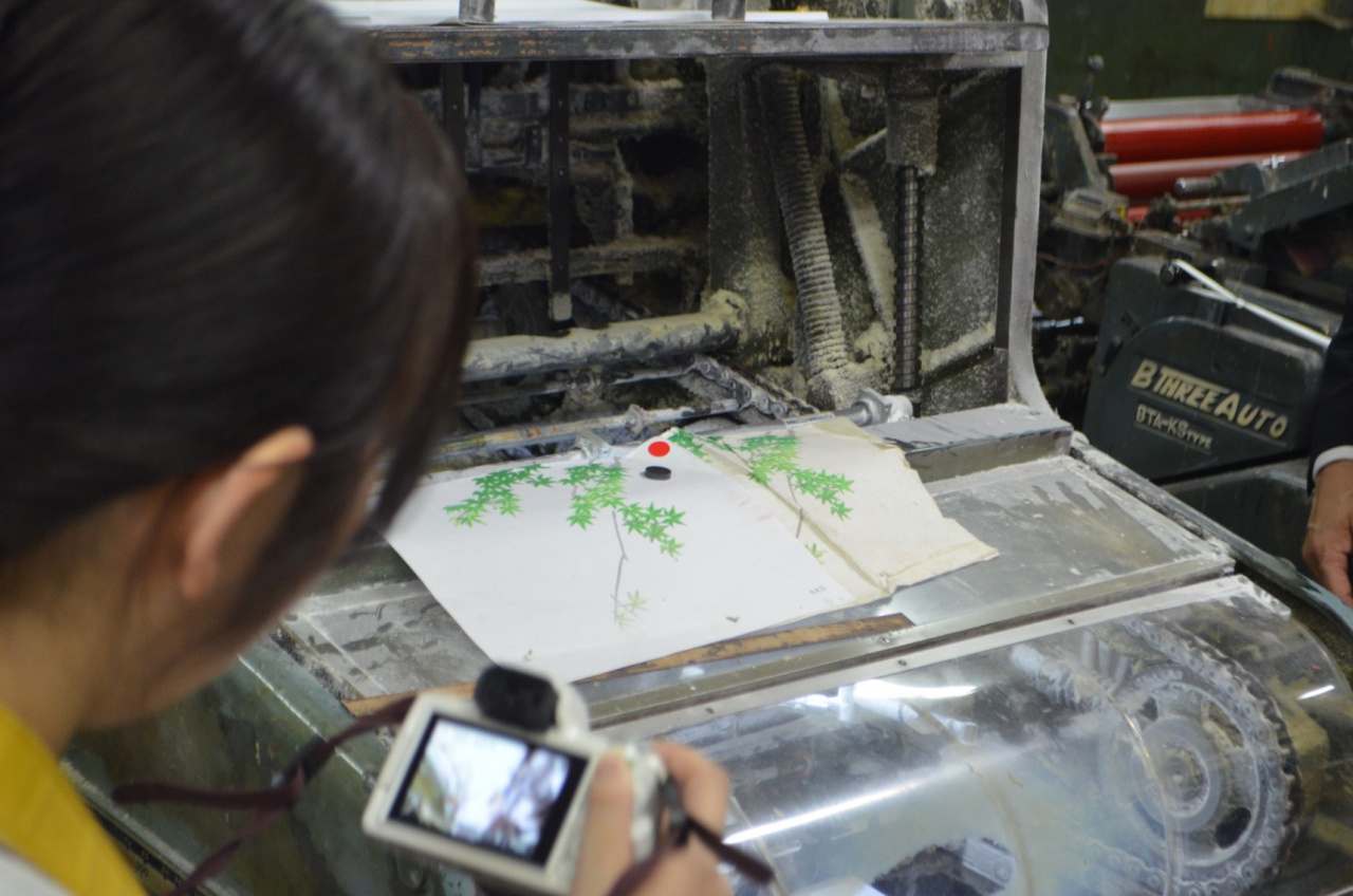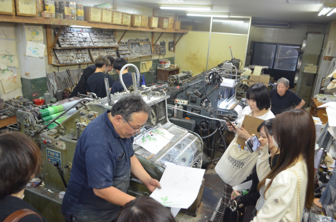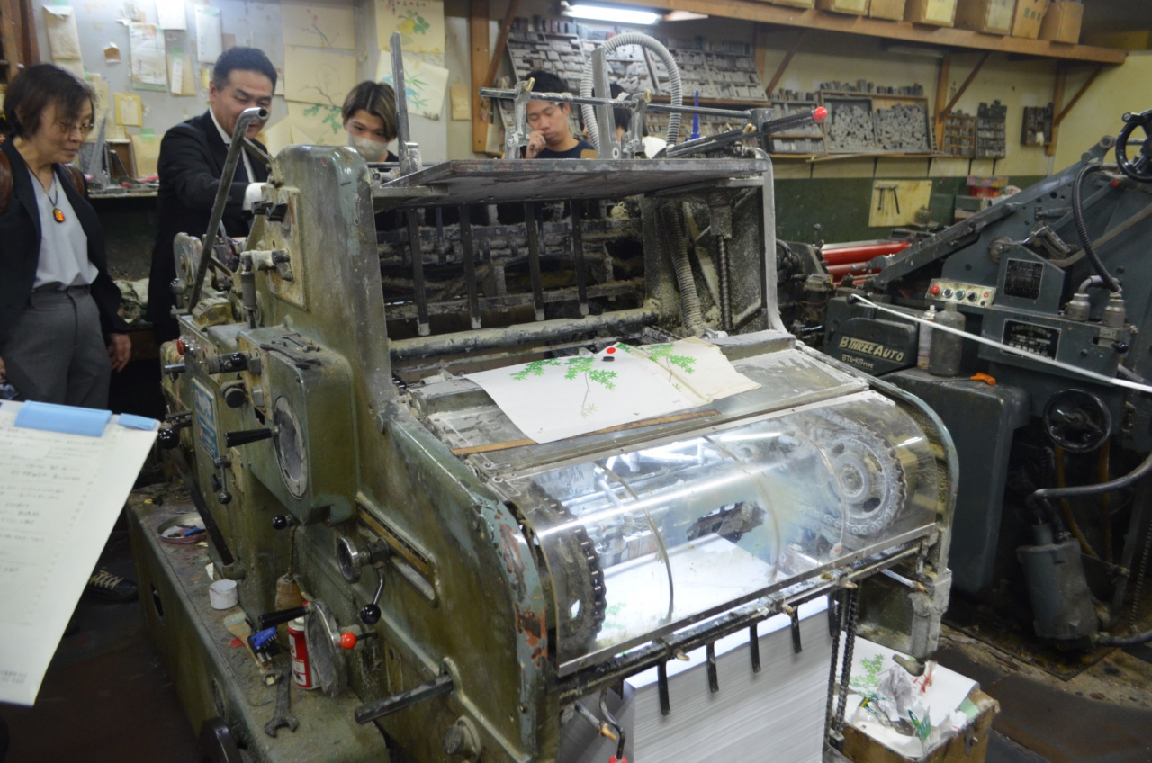 後半では、協力会社のひとつである「古谷印刷」をご紹介いただき、生産現場を見学させていただきました。100年近く現役で稼働している印刷機には、掛け紙のデザインにグラデーションを加えるよう独自のカスタマイズが施され、小気味よいリズムとともに和菓子の外装を彩る掛け紙が印刷されていました。