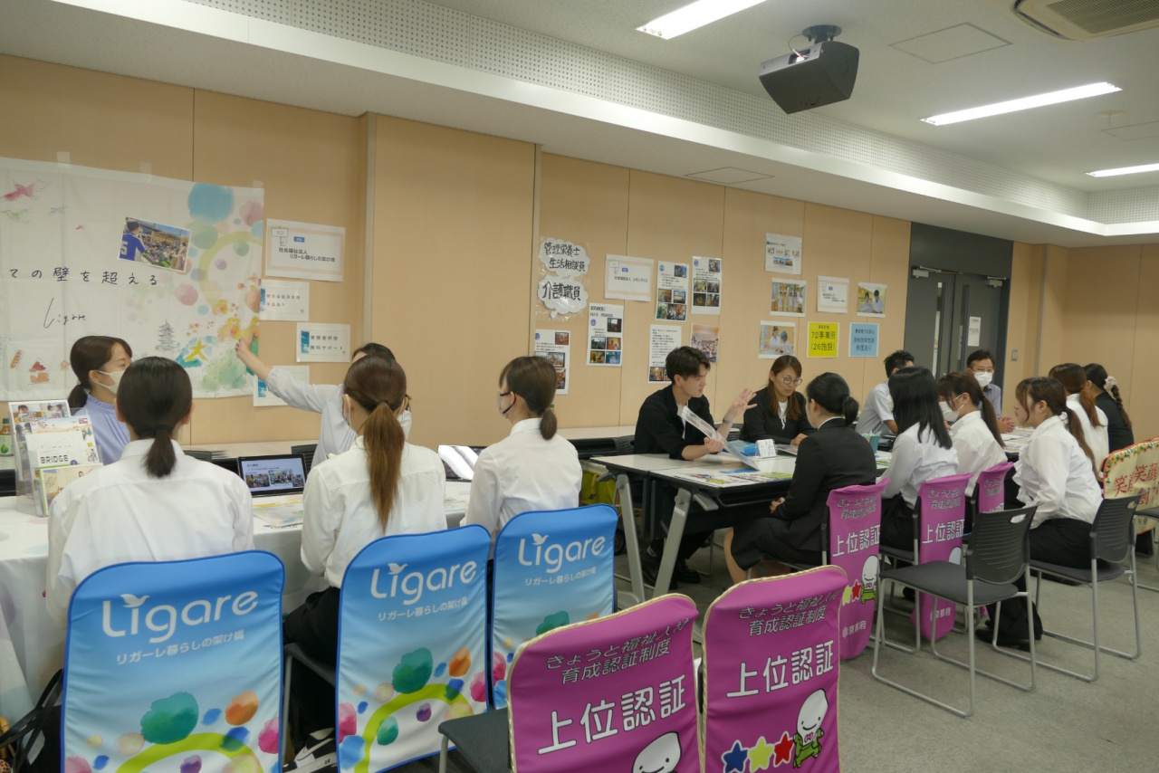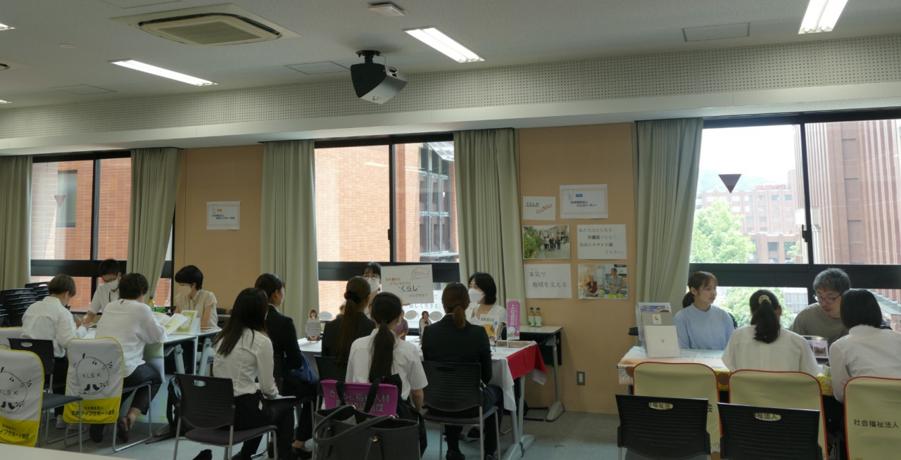 ご協力をいただいたのは「きょうと福祉人材育成認証制度」で認証を受けている12法人の方々です。高齢者や障害者・児、子どもの支援など、各法人の取り組みを1分間スピーチでご紹介していただき、学生は興味・関心をもった法人のブースで職員の方に業務内容ややりがい等について詳しくお話を聴き、実習や進路に役立てられる機会となりました。