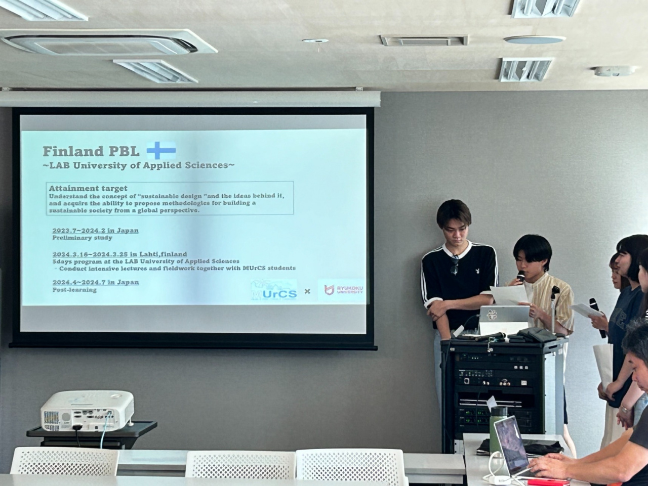 発表では、現地での体験のほか、学んだこと、自身の変化などについても学生自身の言葉で語りました。引率した大石尚子教授からは、自然と人間の距離が近くサスティナビリティが自然な形で根付くフィンランドで、様々な国の学生とディスカッションを交え、現場に触れることで深い学びが実現できたとコメントがありました。