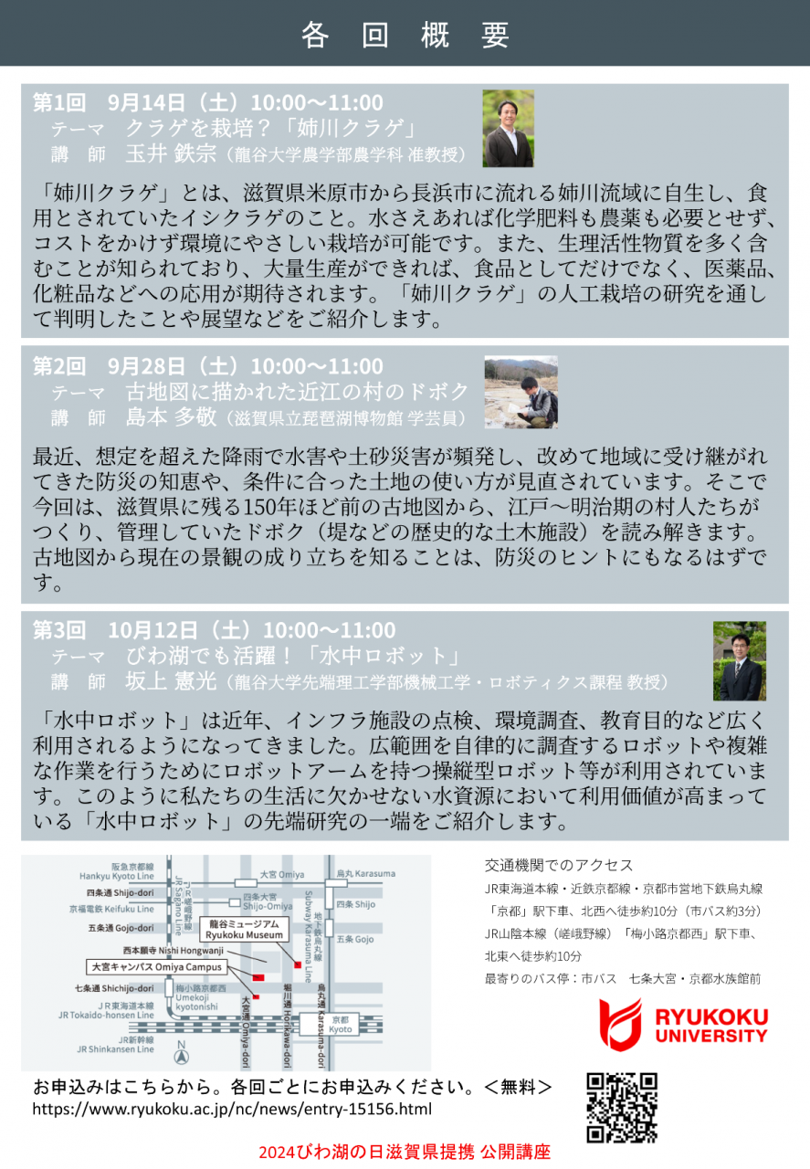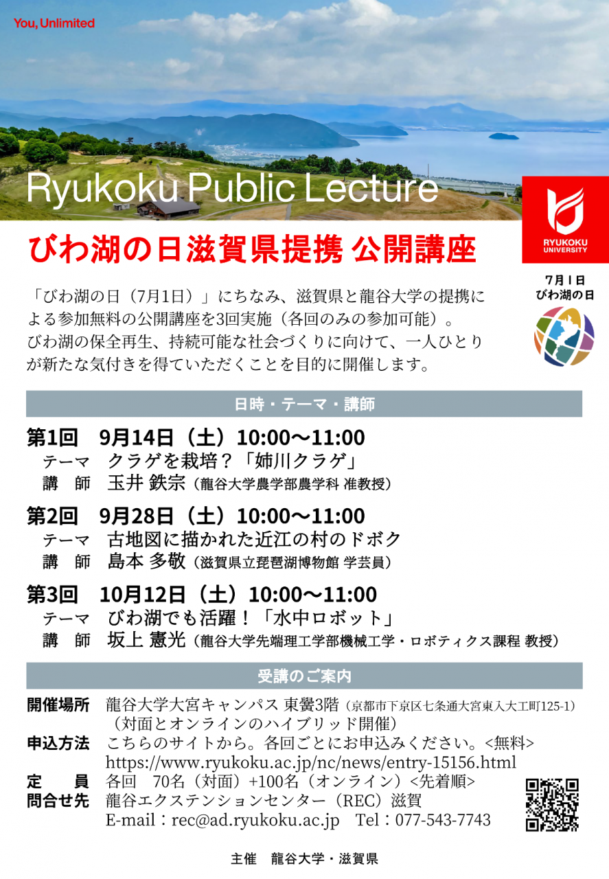 「びわ湖の日(7月1日)」にちなみ、滋賀県と龍谷大学の提携による参加無料の公開講座を3回実施(各回のみの参加可能)。