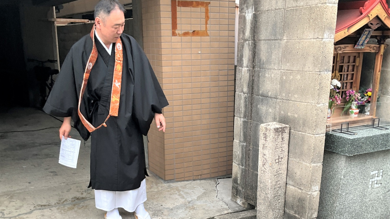 その後、ご住職のご案内で実際に門前町のまち歩きを行い、新撰組に関する史跡もご紹介いただきました。知らなければ通り過ぎてしまうような場所に、かつての新撰組の痕跡が遺されており、ご住職のお話で当時の様子がありありと表現され、受講生はご住職のお話に引き込まれていました。