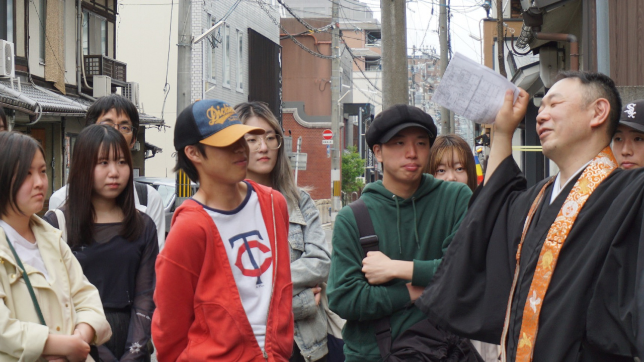 午後からは本願寺門前町にある浄土真宗本願寺派一念寺を訪問しました。一念寺では、まず本学社会学部ご出身のご住職の来歴やお寺での活動についてのお話を伺いました。本願寺門前町にある一念寺には長い歴史があり、周辺地域にもさまざまな歴史的建造物があります。実は、本願寺やその門前町は新撰組との縁が深く、ご住職は新撰組に関する場所を案内するまち歩きを実施されています。