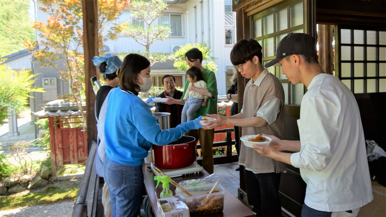 例年、前期に教員の企画でいくつかのお寺に行き、お寺の活動を実地で学ぶ実習を行っています。その一環として、5/25(土)に浄土真宗本願寺派覚明寺(滋賀県守山市)で開催された「みんなの笑顔食堂」に参加しました。