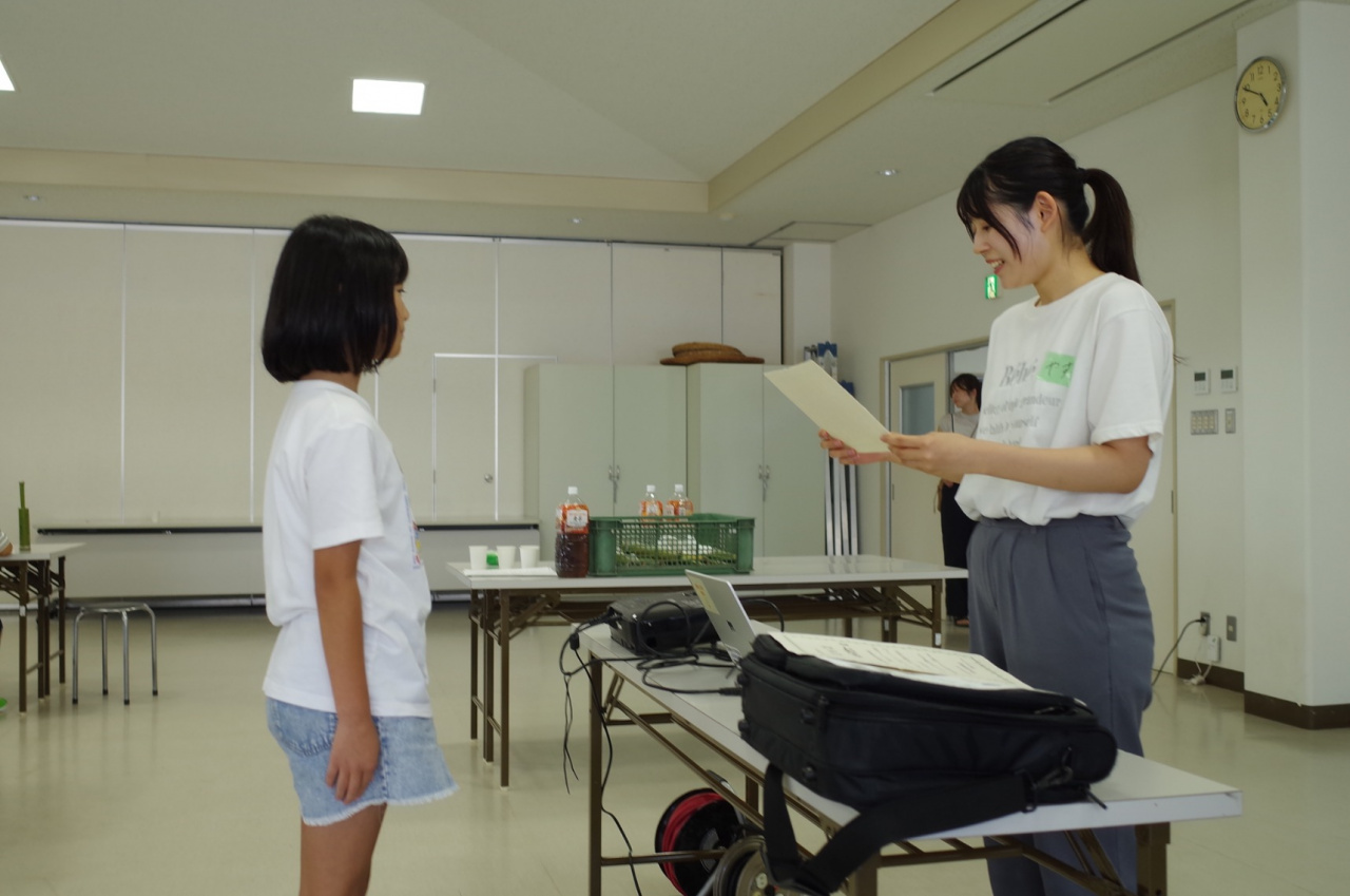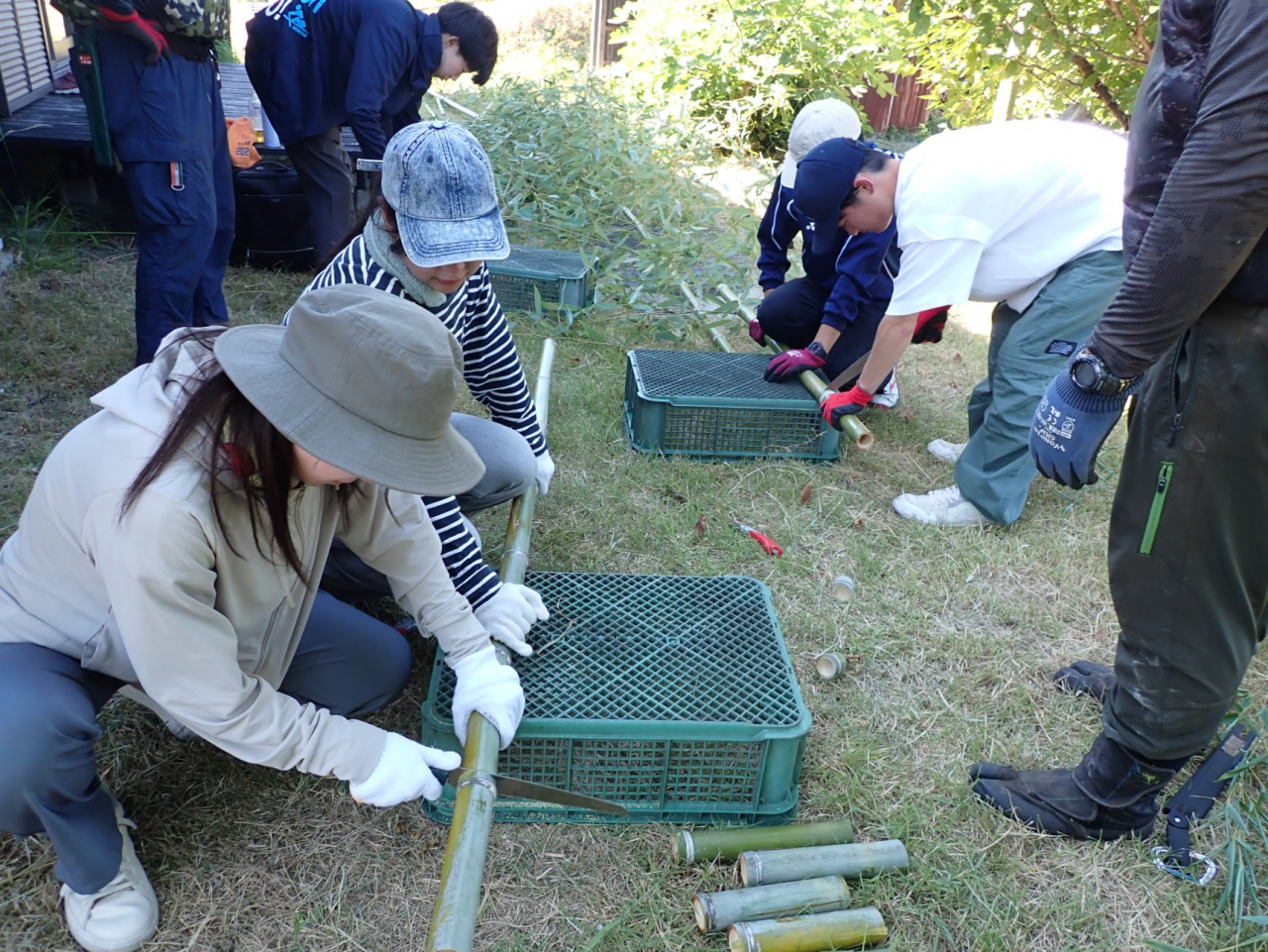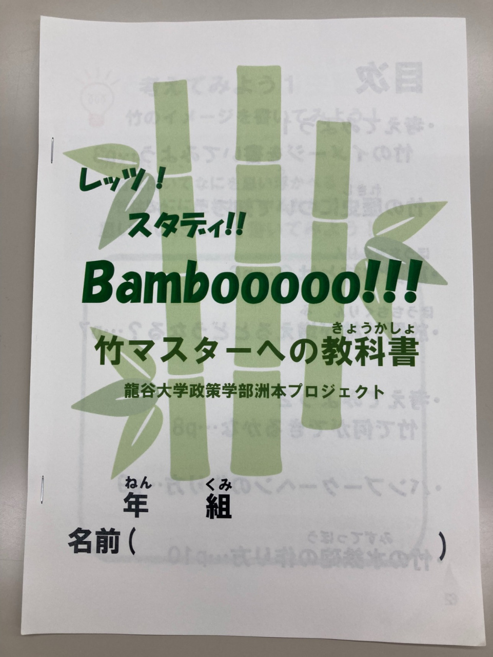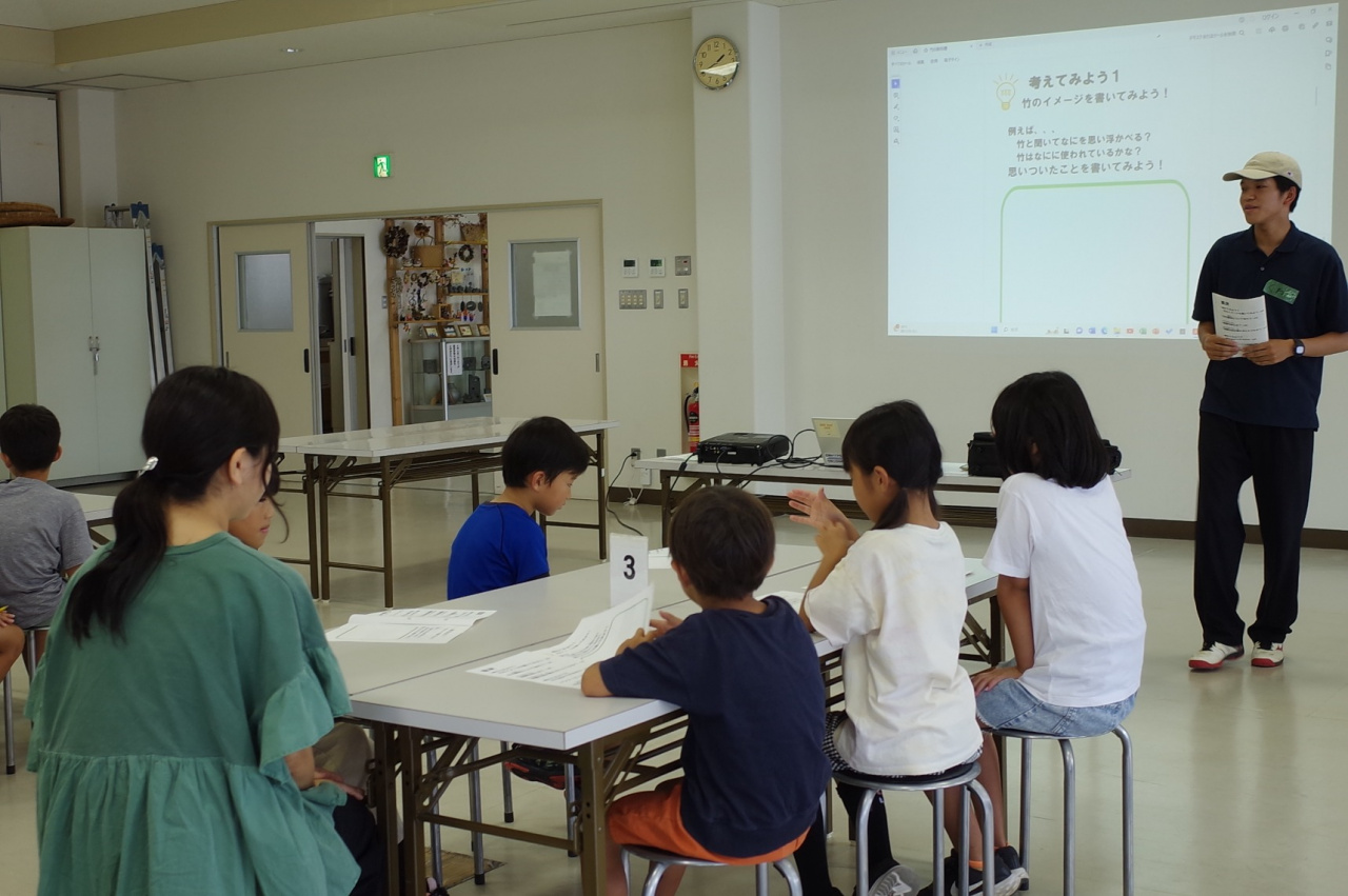イベント当日は、五色町内の小学校などでチラシを配布した成果があり、小学1~6年生の児童13名と保護者2名に参加いただきました。洲本プロジェクト生自作の「竹マスターへの教科書」を読みながら、竹の歴史や放置竹林について学びます。昔はいろいろな場所で竹が使われていたけれど、今はプラスチック製品や金属に替わったこと。そのため、手入れが行き届かず放置される竹林が増え、獣害や景観悪化、土砂崩れなどを起こしていることを伝えます。