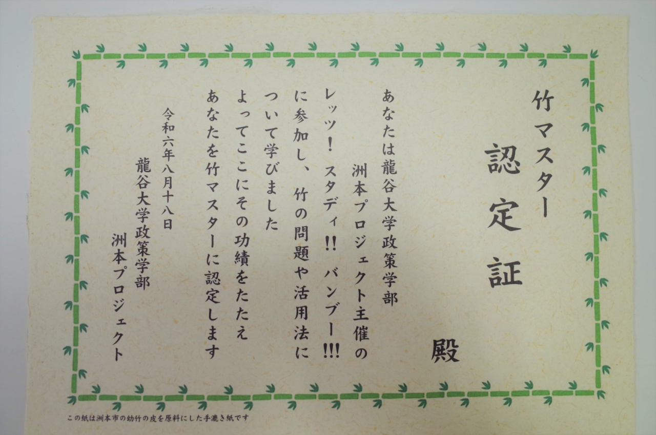 食後は、今日学んだことや感想を教科書に書きこみ、最後に「竹マスター認定証」を渡す授与式で締めました。この賞状は、大同印刷所の大西さんに協力いただき、幼竹の皮を原料にした和紙で作られています。夏休みの自由研究として熱心に写真を撮る子どもたちがいたので、学校で発表してもらえると嬉しい限りです。