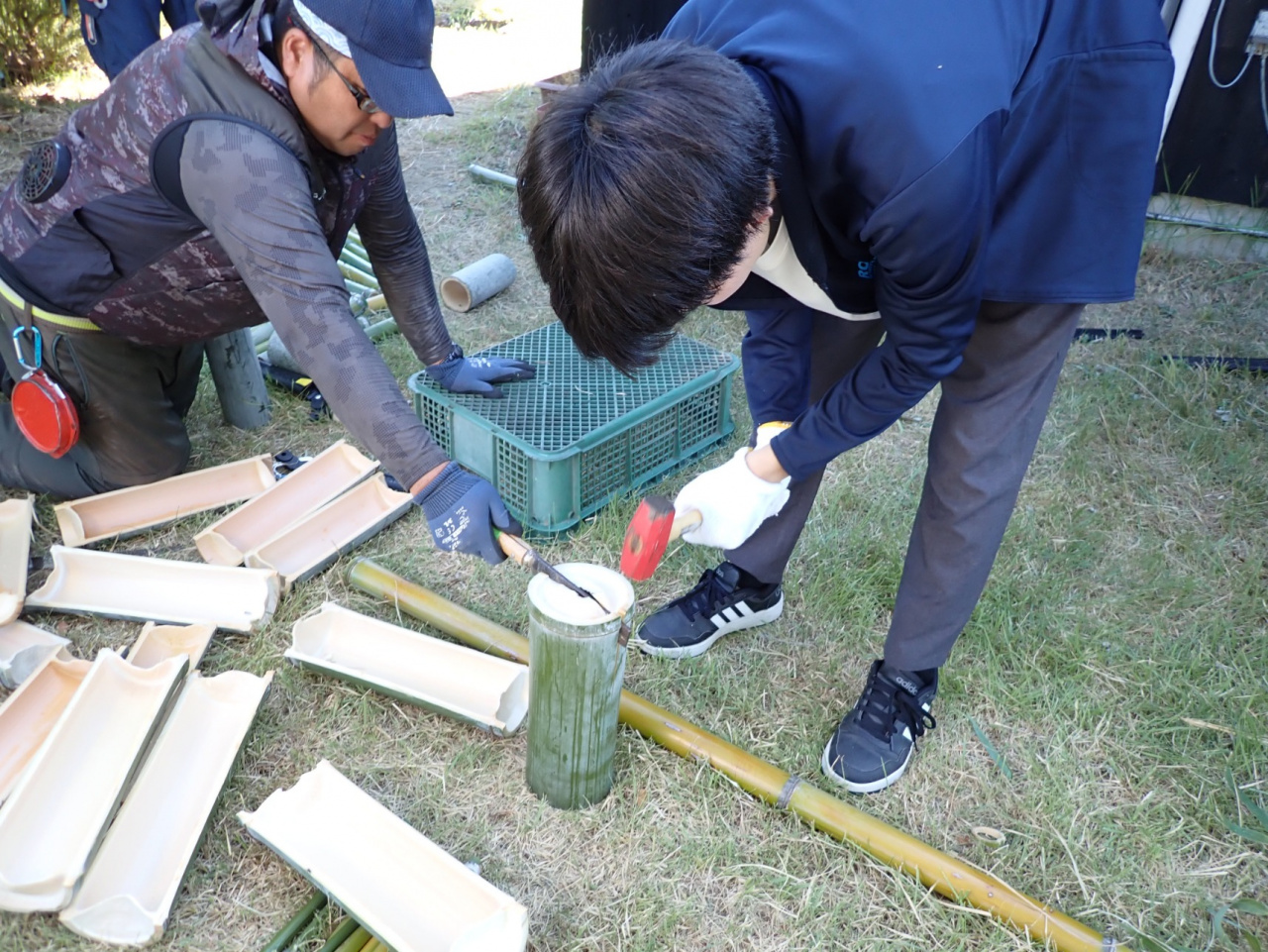 前日から現地に入って、安乎町の竹林であわじ里山プロジェクトの辻さんと竹を刈り水鉄砲や竹皿を準備。夏はやぶ蚊が多く竹林に入りづらいため、イベント会場はウェルネスパーク五色夢工房を選びました。