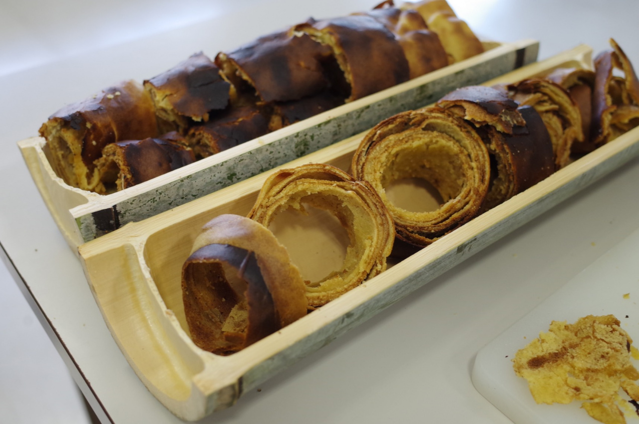 実際のものづくりでは、水鉄砲にドリルで穴を開ける作業を子どもたちにしてもらいました。そのあとは本日のメインであるバンブークーヘンづくり。生地を竹の筒にたらし落ちないように回しながら焼くのですが、焦げないように且つしっかり火を通すのはコツがいります。半焼けのまま層を重ねると、生地の重みで剥がれ落ちるハプニングが。「あ~残念!! …もう1回作ろう」と再チャレンジするチームもありました。