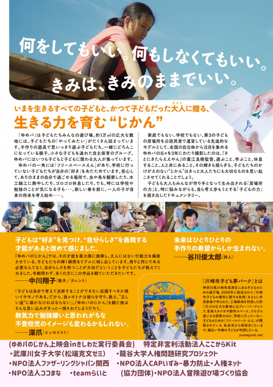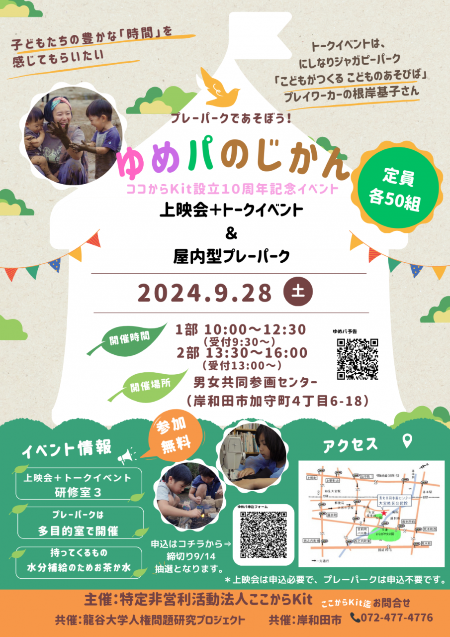 人権問題研究プロジェクト「子どもの居場所と発達」(代表:文学部 渋谷亮)が、岸和田市で子育て支援や居場所づくりなどを展開している「特定非営利活動法人ここからKit」の設立10周年記念イベント「『ゆめパのじかん』上映会+トークイベント」を共催します。屋内型プレーパークも開催します。