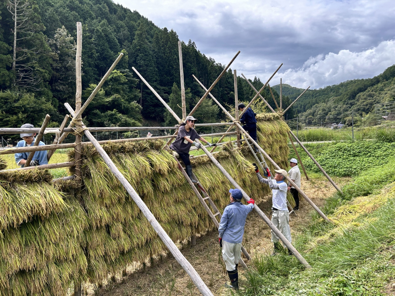 2日目は朝8時から日吉町生畑にある「日良し米」の圃場に集合し、この地域で継承されてきた高稲木の組み立てのお手伝いと、伝統的な技術の次世代への継承のため組み立ての工程を映像に収めました。長さ約4間、高さ8段の高稲木が完成しました。