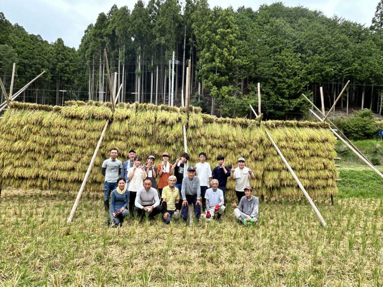 高稲木の組み立てと同時進行で稲刈りも体験しました。バインダーという機械で稲を刈り、結束された稲の束を拾って稲木に掛けていきました。3時間ほどで稲刈が完了しました。