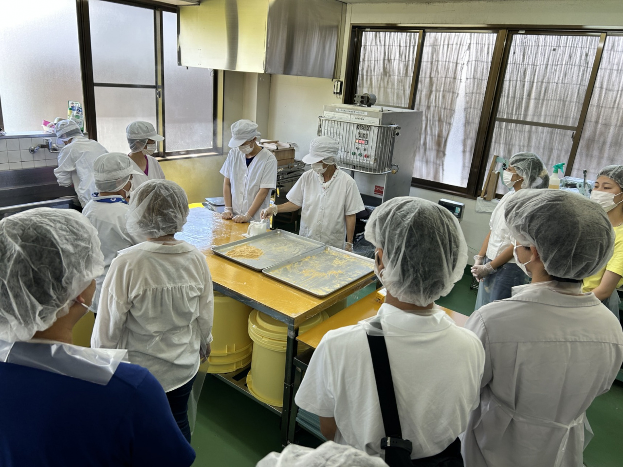 1日目午前は昨年度から続けている納豆餅の商品化のため、先駆的に取り組まれている(有)山国さきがけセンター(京都市右京区京北町)を訪問し、納豆餅製造ラインの見学と実際に納豆餅づくりを体験しました。日頃から納豆餅について考えてきて問題意識の明確な学生にとっては、多くのノウハウが得られました。