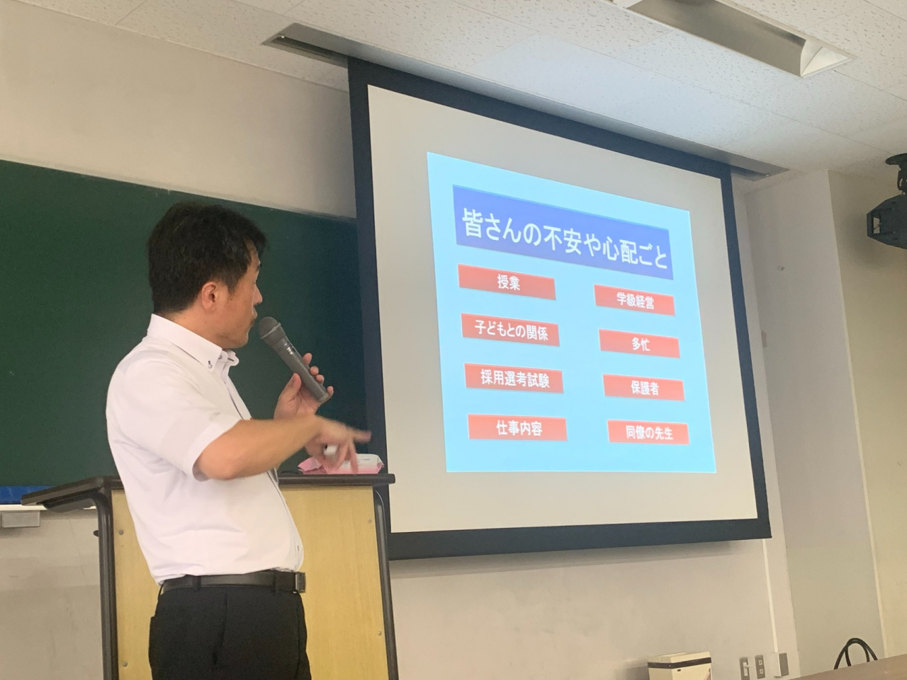 当日は、滋賀県が求める教員像、教員採用選考試験のお話に加えて、参加した学生からの質問に回答する対話形式の時間も設けられました。