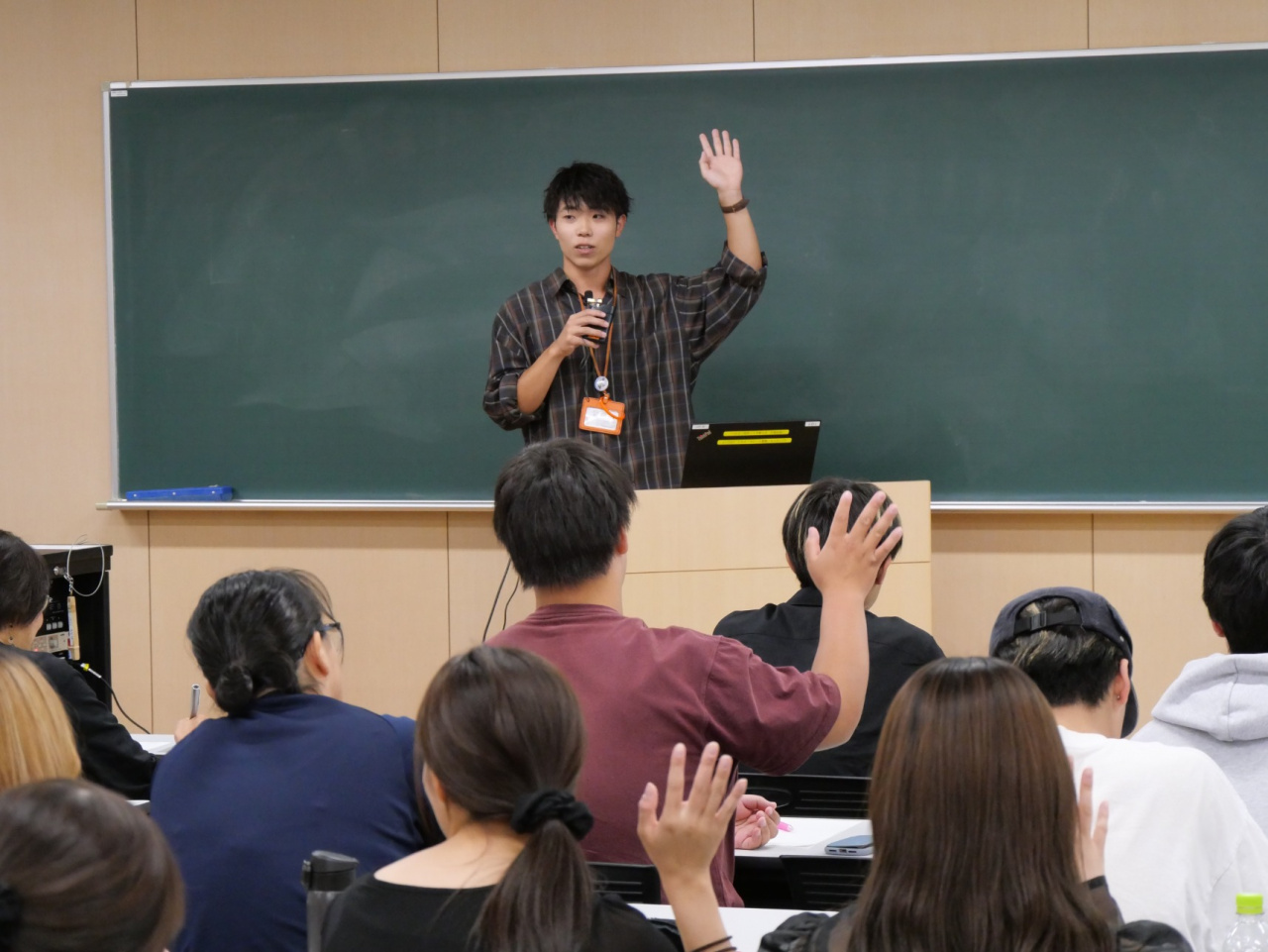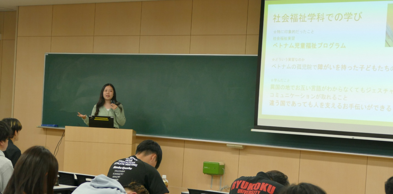 社会福祉学科では、今後のキャリアを検討するために1回生へ向けて卒業生によるキャリアアップガイダンスを実施しています。