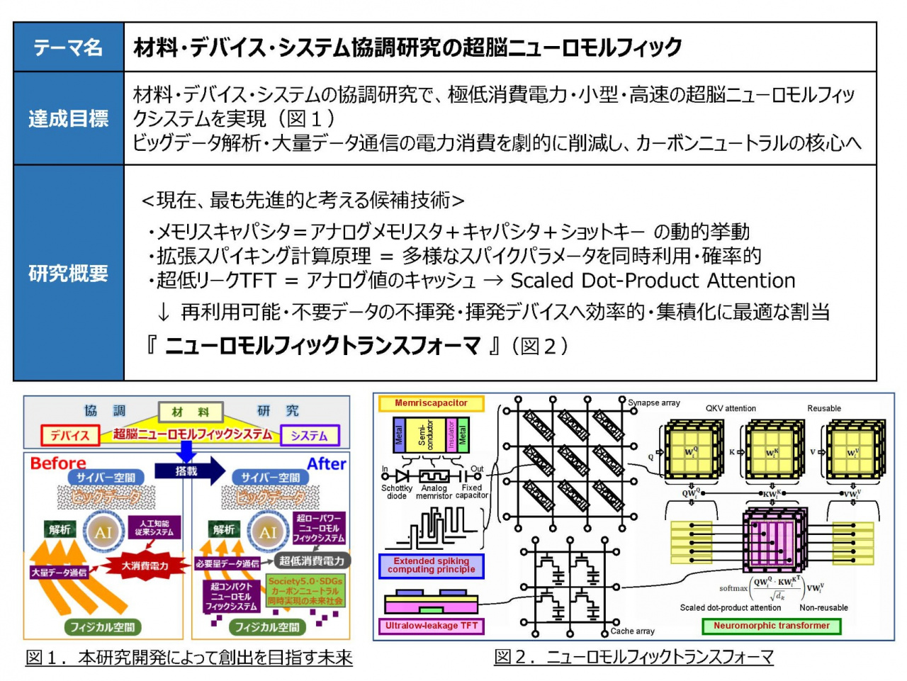 材料・デバイス・システム協調研究で、超脳(脳を超える)ニューロモルフィックシステムとして、メモリスキャパシタ・スパイキング計算原理によるトランスフォーマを研究します。Society 5.0で懸念のビッグデータ解析・大量データ通信に要する莫大な電力消費を1/100へ削減します。日本の優れた材料・製造技術を武器とし、集積化・システム・アプリケーションの不利な状況を払拭し、エレクトロニクス業界の最後の大逆転につながることを夢見ます。