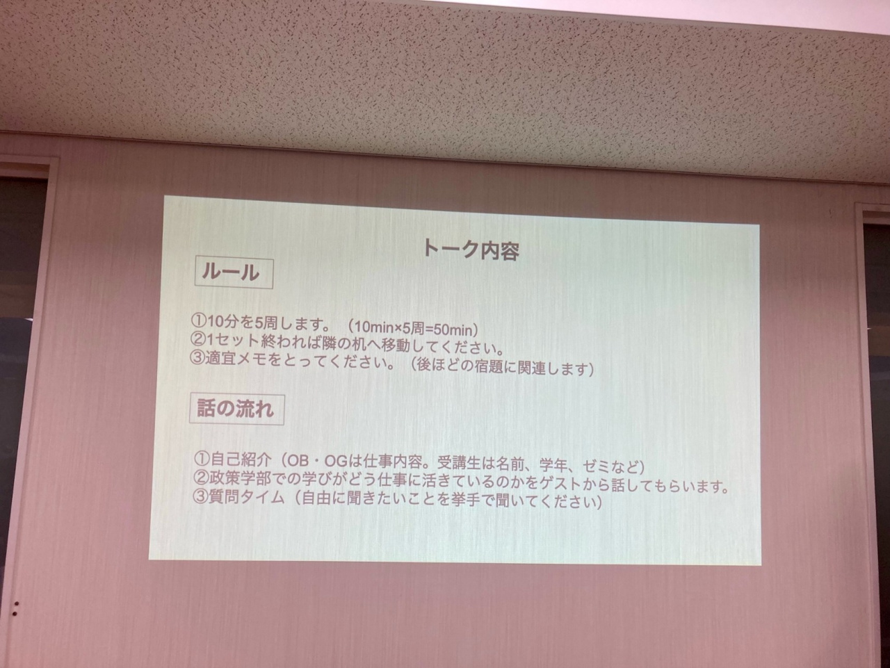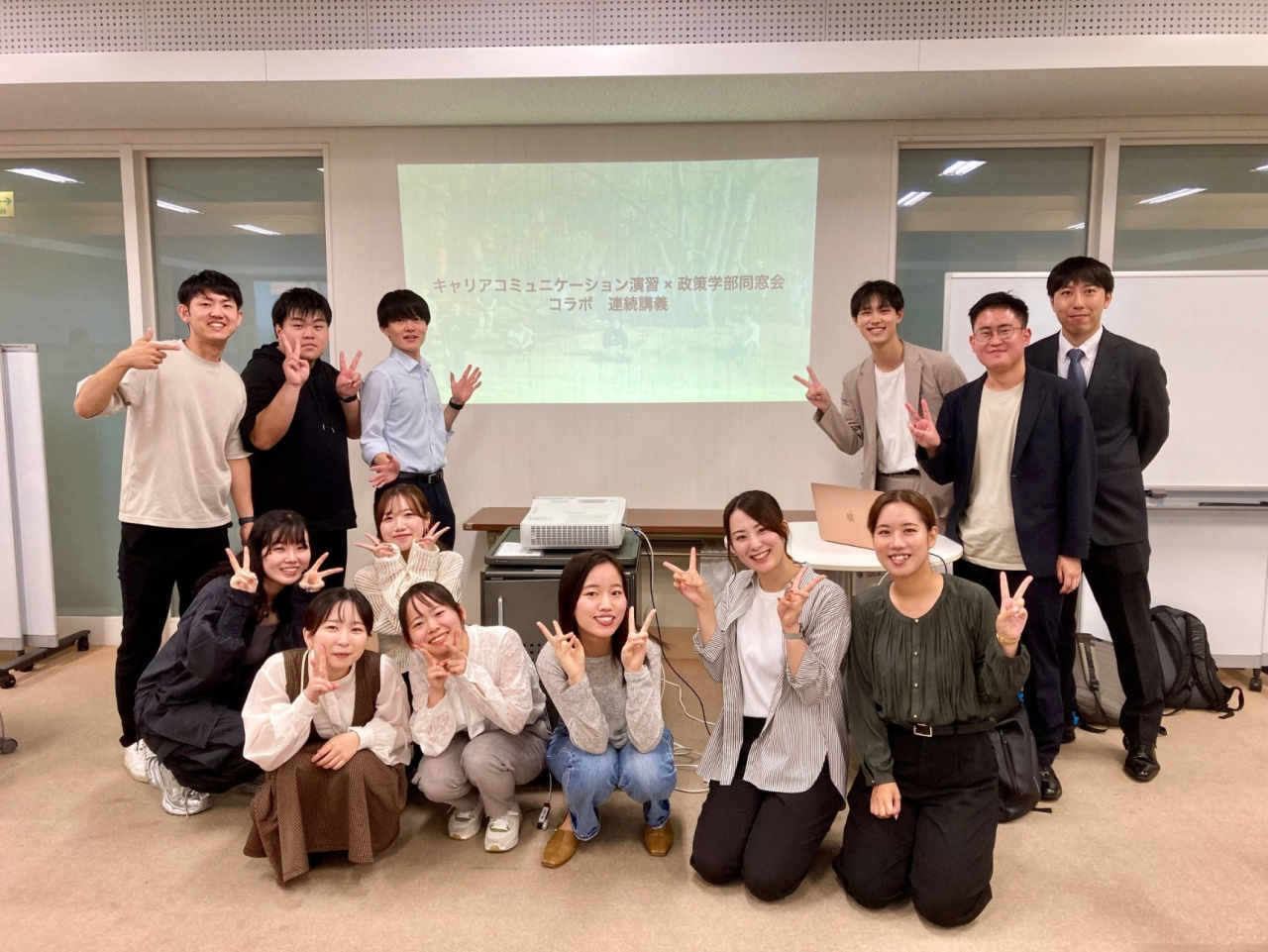 政策学部同窓会ライフデザイン班のメンバーが、10月4日、11日、25日の3回分の授業の企画・コーディネート・進行担当です。同窓会ライフデザイン班では、政策学部OB/OGが社会人の先輩として、在校生にアドバイスをするだけでなく、卒業生と在校生とともに、キャリアや人生を考える場を生み出すことを目標に活動しています。