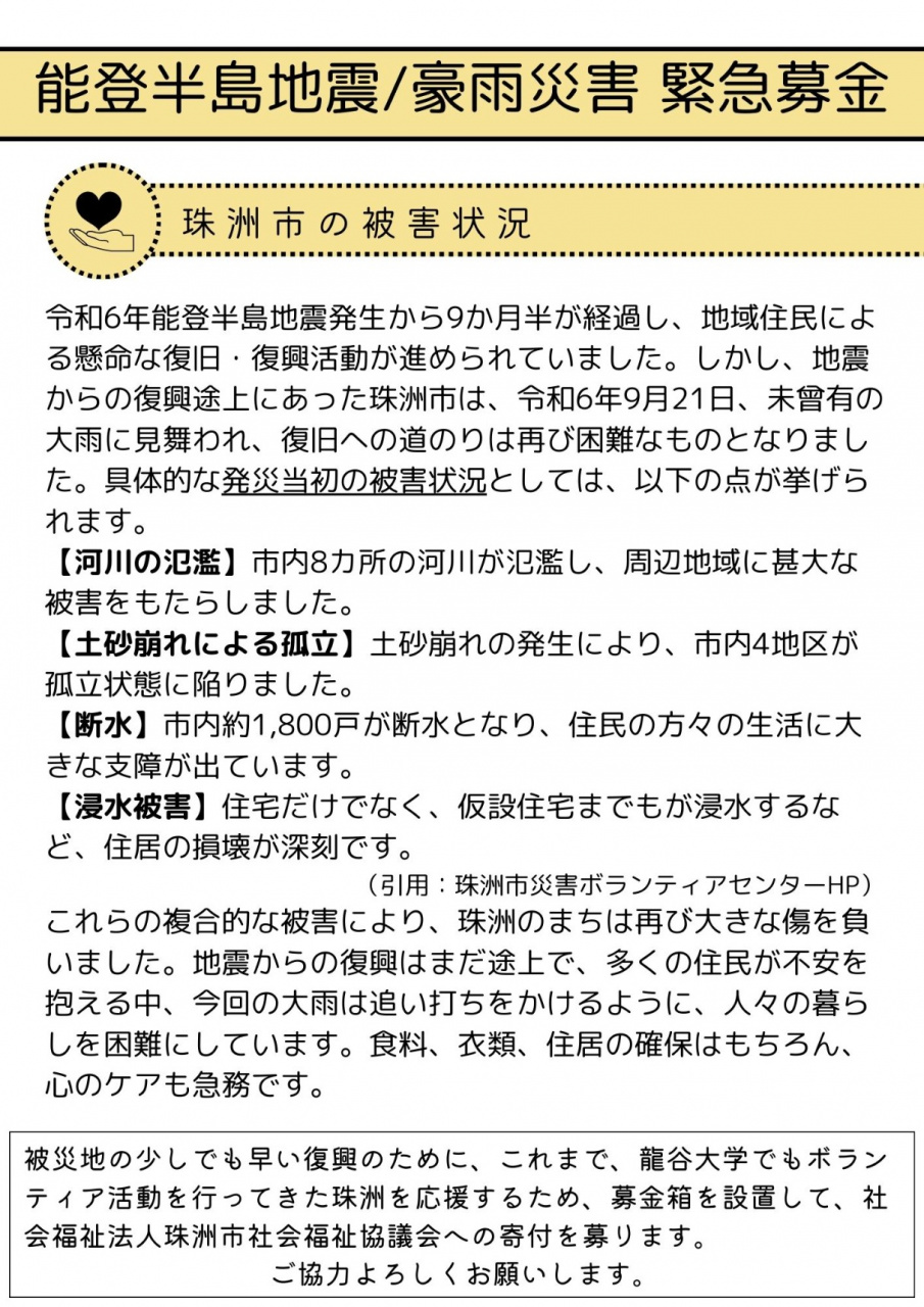 龍谷大学ボランティア・NPO活動センターでは、2024年9月21日から23日にかけて発生した令和6年9月能登半島豪雨の被災地支援の一環として、