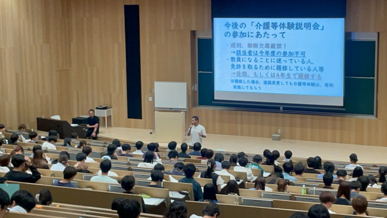 2024.10.11 2025年度介護等体験説明会を実施 2025年度に介護等体験を希望する学生を対象に説明会を実施しました。 体験の概要や今後のスケジュールについて説明が行われ、体験に行くにはすべての説明会・講演会に出席すること、申込についても締切に遅れることのないようにと厳しく指導されました。 また2024年度に実際に体験先から指摘を受けた事例を紹介し、学生としてではなく社会人としてふさわしいマナーで体験に臨むようにとの説明がなされました。