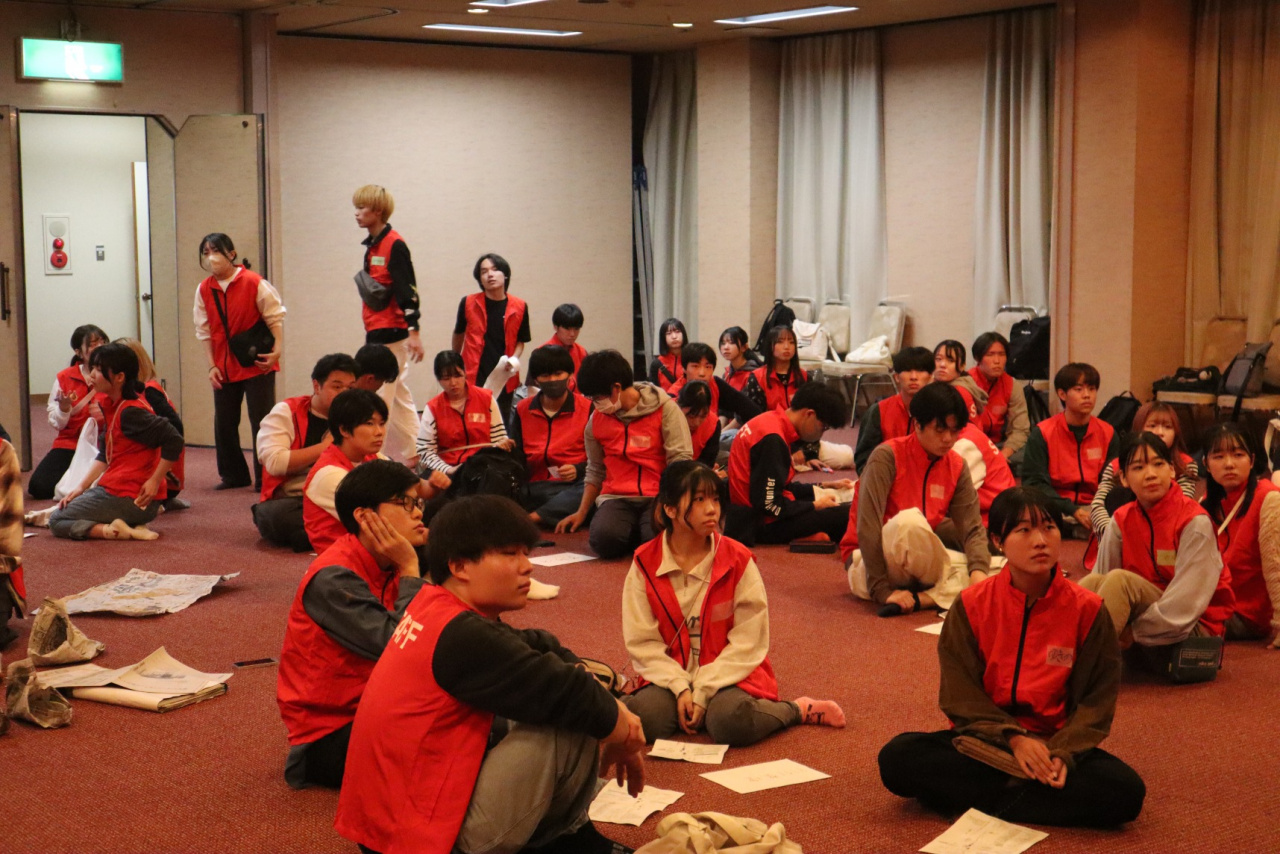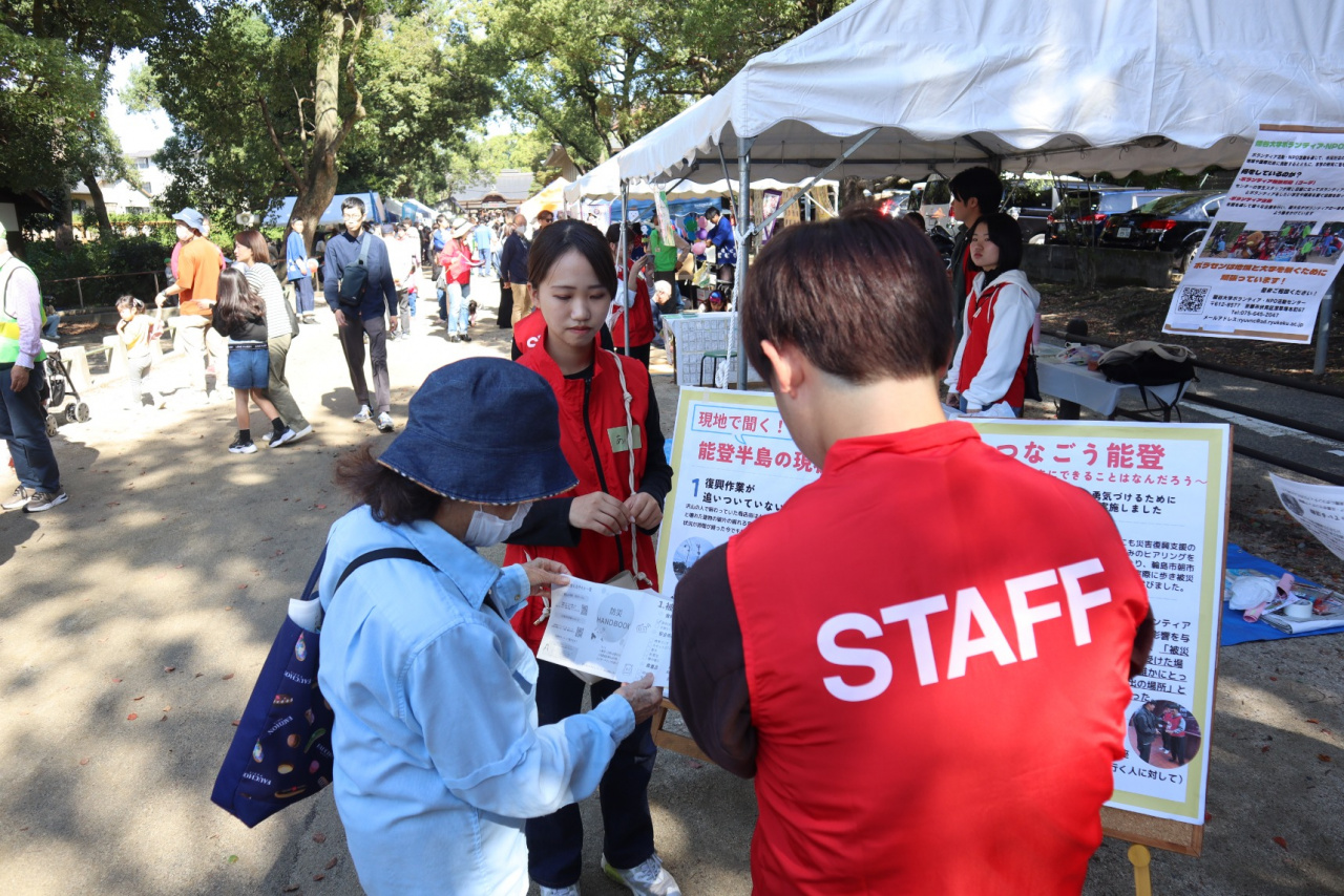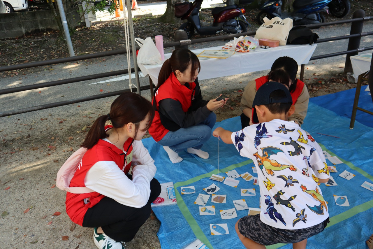 学生スタッフが内容考えた防災学習ブース(魚釣り・防災グッズ作り・能登半島でのボランティア活動報告)の運営やお祭り全体の運営サポート(ゴミ分別ブースや飲食ブース等の行列整理、舞台アナウンス、着ぐるみ補助等)を担いました。