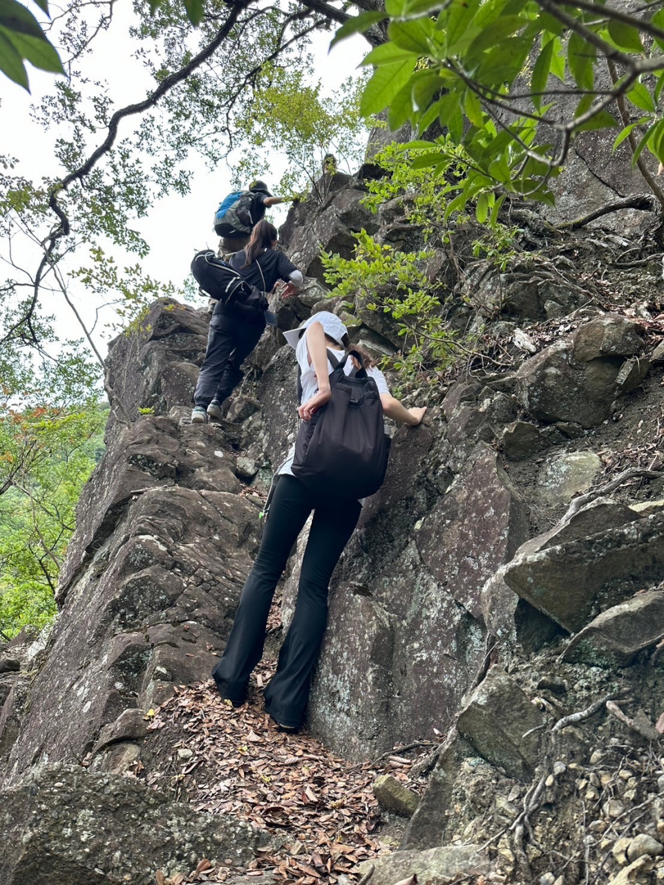 1日目午前、犬鳴山で最初に崖から上半身を乗り出す「西の覗き」をおこないました。