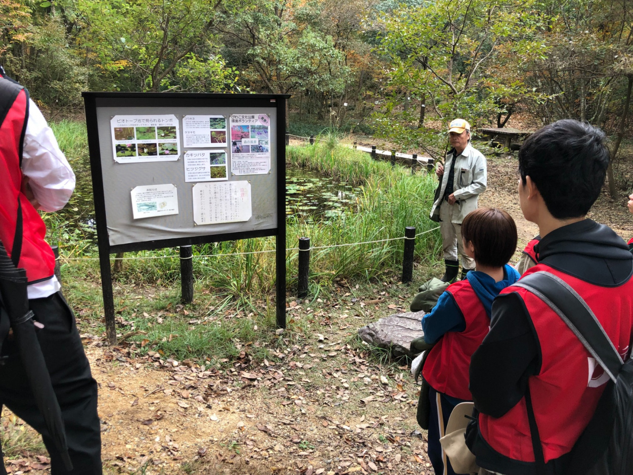 後片付け後、金子先生の案内で森林ゾーンを散策。今迄に植栽された樹木やビオトープを見学しながら、生態系を守るためのこだわりポイントなどのお話も伺いました。