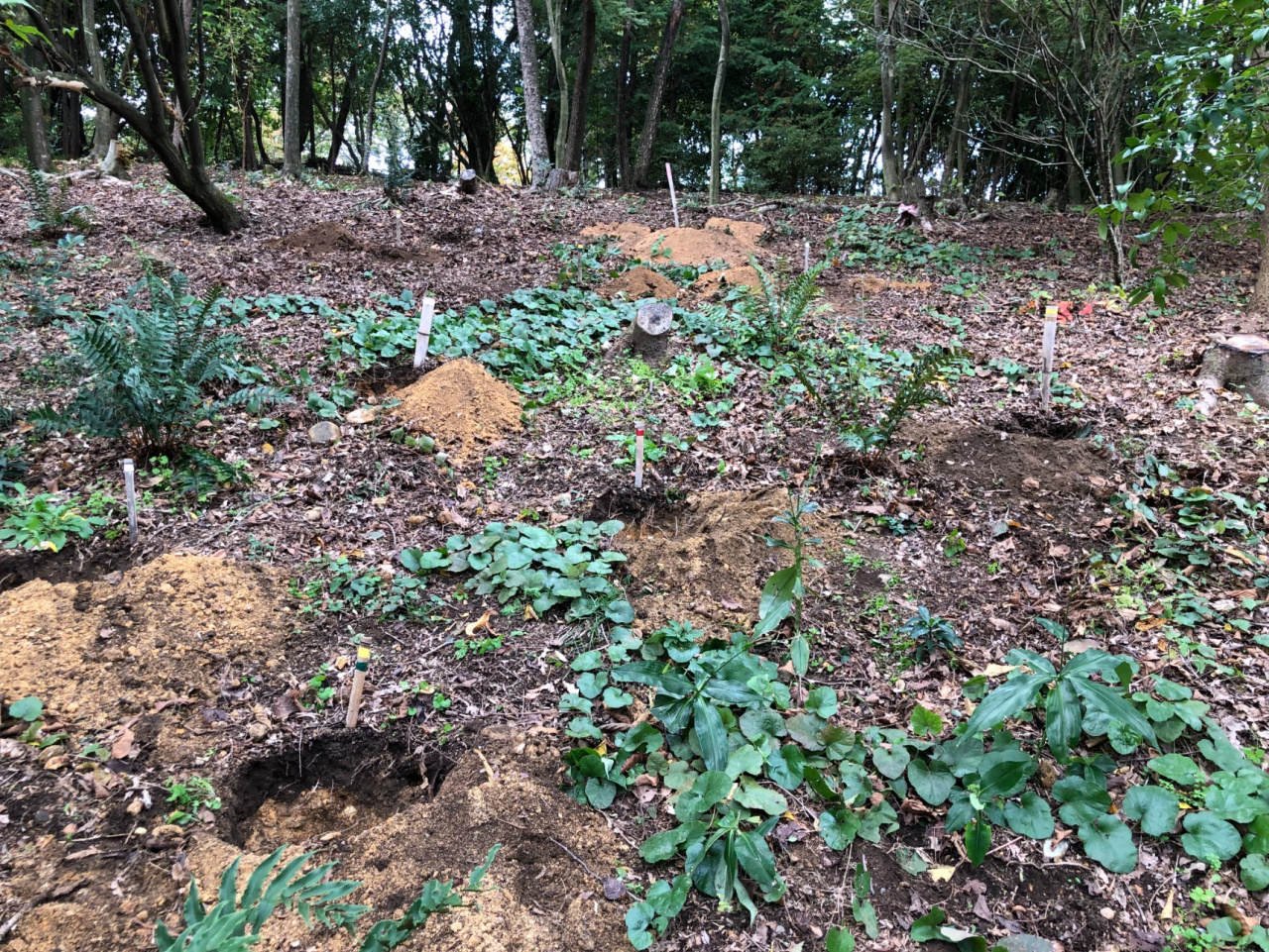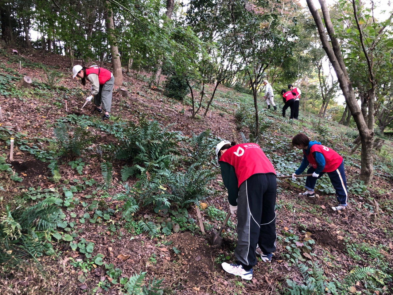季節によって活動内容は異なり、この日は斜面に苗木を植えるための穴掘りに奮闘しました。緩やかではあるものの不安定な斜面で、ツルハシやスコップなどを使って30-60cmの幅と深さに掘っていくという体力が必要な活動でしたが、自然に囲まれた中で気持ちの良い汗をかくことができました。
