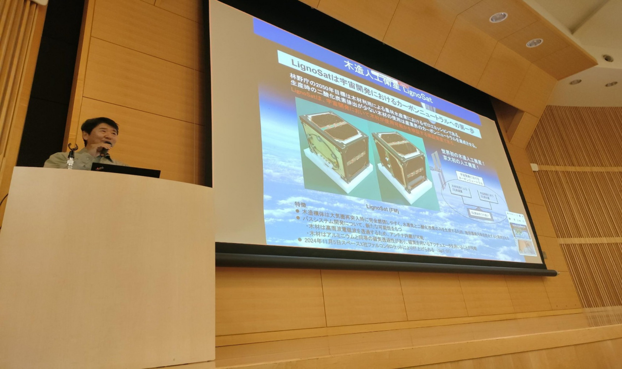 授業の後半では、2024年11月5日に打ち上げられた世界初の木造人工衛星「LignoSat(リグノサット)」の開発にかかる道のりや、木材の宇宙空間における耐久性実験等についてのお話をいただきました。