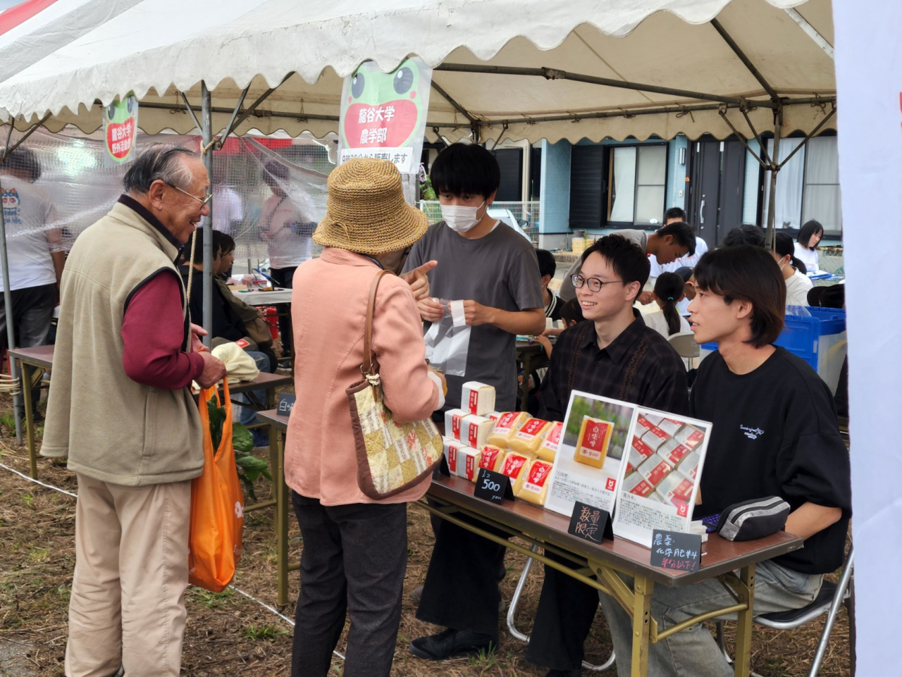 農学部学生広報スタッフは、農学部牧農場で開講している「食の循環実習」で栽培・収穫した龍谷米と、農学部牧農場および農事組合法人ふぁーむ牧で収穫した大豆・近江米を使用した白味噌を販売しました。